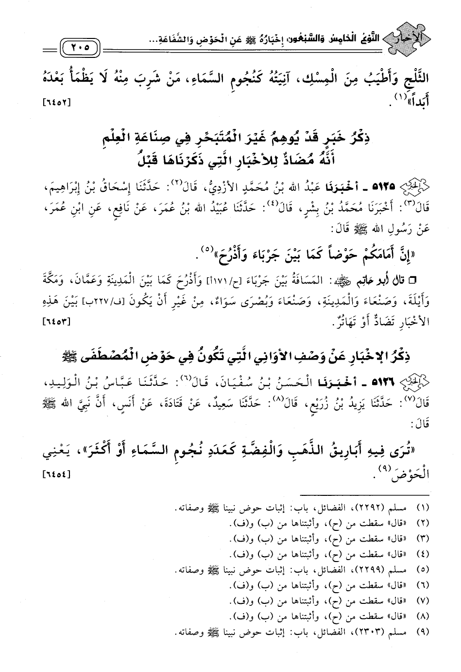 ٥١٢٦ - أَخبَرنا الْحَسَنُ بْنُ سُفْيَانَ، قَالَ: حَدثنا عَبَّاسُ بْنُ الْوَلِيدِ، قَالَ: حَدثنا يَزِيدُ بْنُ زُرَيْعٍ، قَالَ: حَدثنا سَعِيدٌ، عَنْ قَتَادَةَ، عَنْ أَنَسٍ، أَنَّ نَبِيَّ اللهِ صَلى الله عَلَيه وسَلم قَالَ: "تُرَى فِيهِ أَبَارِيقُ الذَّهَبِ وَالْفِضَّةِ كَعَدَدِ نُجُومِ السَّمَاءِ أَوْ أَكْثَرَ". يَعْنِي: الْحَوْضَ. [٦٤٥٤]