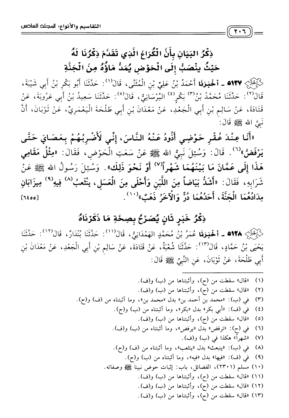 ٥١٢٨ - أَخبَرنا عُمَرُ بْنُ مُحَمَّدٍ الْهَمْدَانِيُّ، قَالَ: حَدثنا بُنْدَارٌ، قَالَ: حَدثنا يَحْيَى بْنُ حَمَّادٍ، قَالَ: حَدثنا شُعْبَةُ، عَنْ قَتَادَةَ، عَنْ سَالِمِ بْنِ أَبِي الْجَعْدِ، عَنْ مَعْدَانَ بْنِ أَبِي طَلْحَةَ، عَنْ ثَوْبَانَ، عَنِ النَّبِيِّ صَلى الله عَلَيه وسَلم قَالَ: "إِنِّي لَبِعُقْرِ حَوْضِي أَذُودُ عَنْهُ لأَهْلِ الْيَمِينِ، أَضْرِبُ بِعَصَايَ حَتَّى يَرْفَضَّ"، فَسُئِلَ عَنْ عَرْضِهِ، فَقَالَ: "مِنْ مَقَامِي هَذَا إِلَى عَمَّانَ"، وَسُئِلَ عَنْ شَرَابِهِ، فَقَالَ: "أَشَدُّ بَيَاضًا مِنَ اللَّبَنِ، وَأَحْلَى مِنَ الْعَسَلِ، فِيهِ مِيزَابَانِ يُمَدَّانِ مِنَ الْجَنَّةِ. أَحَدُهُمَا مِنْ ذَهَبٍ، وَالآخَرُ مِنْ وَرِقٍ". قَالَ بُنْدَارٌ: فَقُلْتُ لِيَحْيَى بْنِ حَمَّادٍ: هَذَا حَدِيثُ أَبِي عَوَانَةَ؟ فَقَالَ: قَدْ سَمِعْتُهُ مِنْ أَبِي عَوَانَةَ أَيْضًا، فَقُلْتُ: انْظُرْ لِي فِي حَدِيثِ شُعْبَةَ، فَنَظَرَ فِيهِ، فَحَدَّثَنِي بِهِ. [٦٤٥٦]