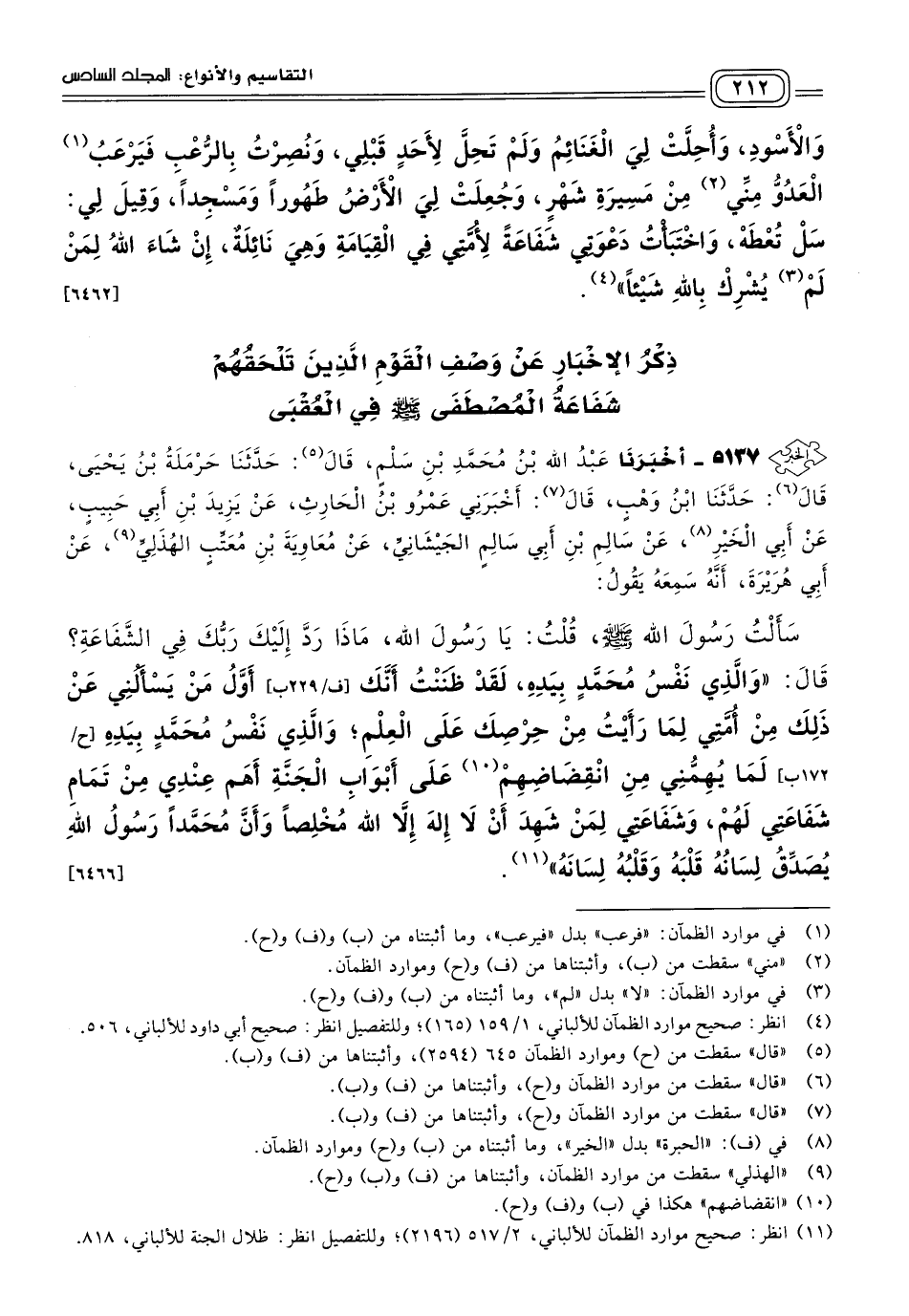 ٥١٣٧ - أَخبَرنا عَبْدُ اللهِ بْنُ مُحَمَّدِ بْنِ سَلْمٍ، قَالَ: حَدثنا حَرْمَلَةُ بْنُ يَحْيَى، قَالَ: حَدثنا ابْنُ وَهْبٍ، قَالَ: أَخْبَرَنِي عَمْرُو بْنُ الْحَارِثِ، عَنْ يَزِيدَ بْنِ أَبِي حَبِيبٍ، عَنْ أَبِي الْخَيْرِ، عَنْ سَالِمِ بْنِ أَبِي سَالِمٍ الْجَيْشَانِيِّ، عَنْ مُعَاوِيَةَ بْنِ مُعَتِّبٍ الْهُذَلِيِّ، عَنْ أَبِي هُرَيْرَةَ، أَنَّهُ سَمِعَهُ يَقُولُ: سَأَلْتُ رَسُولَ اللهِ صَلى الله عَلَيه وسَلم، قُلْتُ: يَا رَسُولَ اللهِ، مَاذَا رَدَّ إِلَيْكَ رَبُّكَ فِي الشَّفَاعَةِ؟ قَالَ: "وَالَّذِي نَفْسُ مُحَمَّدٍ بِيَدِهِ، لَقَدْ ظَنَنْتُ أَنَّكَ أَوَّلُ مَنْ يَسْأَلُنِي عَنْ ذَلِكَ مِنْ أُمَّتِي لِمَا رَأَيْتُ مِنَ حِرْصِكَ عَلَى الْعِلْمِ، وَالَّذِي نَفْسُ مُحَمَّدٍ بِيَدِهِ لَمَا يُهِمُّنِي مِنَ انْقِضَاضِهِمْ عَلَى أَبْوَابِ الْجَنَّةِ أَهَمُّ عِنْدِي مِنْ تَمَامِ شَفَاعَتِي لَهُمْ، وَشَفَاعَتِي لِمَنْ شَهِدَ أَنْ لَا إِلَهَ إِلَاّ اللهُ مُخْلِصًا، وَأَنَّ مُحَمَّدًا رَسُولُ اللهِ يُصَدِّقُ لِسَانُهُ قَلْبَهُ وَقَلْبُهُ لِسَانَهُ". [٦٤٦٦]
