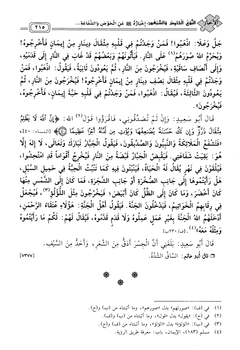 قَالَ أَبُو سَعِيدٍ: وَإِنْ لَمْ تُصَدِّقُونِي فَاقْرَؤُوا قَوْلَ اللهِ: {إِنَّ اللهَ لَا يَظْلِمُ مِثْقَالَ ذَرَّةٍ وَإِنْ تَكُ حَسَنَةً يُضَاعِفْهَا وَيُؤْتِ مِنْ لَدُنْهُ أَجْرًا عَظِيمًا} [النساء: ٤٠]، "فَتَشْفَعُ الْمَلَائِكَةُ وَالنَّبِيُّونَ وَالصِّدِّيقُونَ، فَيَقُولُ الْجَبَّارُ تَبَارَكَ وَتَعَالَى، لَا إِلَهَ إِلَاّ هُوَ: بَقِيَتْ شَفَاعَتِي، فَيَقْبِضُ الْجَبَّارُ قَبْضَةً مِنَ النَّارِ فَيُخْرِجُ أَقْوَامًا قَدِ امْتُحِشُوا، فَيُلْقَوْنَ فِي نَهَرٍ يُقَالُ لَهُ: الْحَيَاةُ، فَيَنْبُتُونَ فِيهِ كَمَا تَنْبُتُ الْحِبَّةُ فِي حَمِيلِ السَّيْلِ، هَلْ رَأَيْتُمُوهَا إِلَى جَانِبِ الصَّخْرَةِ أَوْ جَانِبِ الشَّجَرَةِ، فَمَا كَانَ إِلَى الشَّمْسِ مِنْهَا كَانَ أَخْضَرَ، وَمَا كَانَ إِلَى الظِّلِّ كَانَ أَبْيَضَ، فَيَخْرُجُونَ مِثْلَ اللُّؤْلُؤِ، فَيُجْعَلُ فِي رِقَابِهِمُ الْخَوَاتِيمُ، فَيَدْخُلُونَ الْجَنَّةَ، فَيَقُولُ أَهْلُ الْجَنَّةِ: هَؤُلَاءِ عُتَقَاءُ الرَّحْمَنِ، أَدْخَلَهُمُ اللهُ الْجَنَّةَ بِغَيْرِ عَمَلٍ عَمِلُوهُ وَلَا قَدَمٍ قَدَّمُوهُ، فَيُقَالُ لَهُمْ: لَكُمْ مَا رَأَيْتُمُوهُ وَمِثْلُهُ مَعَهُ".