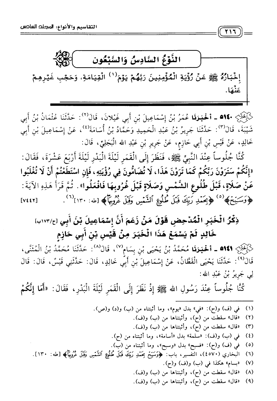 ٥١٤٠ - أَخبَرنا عُمَرُ بْنُ إِسْمَاعِيلَ بْنِ أَبِي غَيْلَانَ، قَالَ: حَدثنا عُثْمَانُ بْنُ أَبِي شَيْبَةَ، قَالَ: حَدثنا جَرِيرُ بْنُ عَبْدِ الْحَمِيدِ، وَحَمَّادُ بْنُ أُسَامَةَ، عَنْ إِسْمَاعِيلَ بْنِ أَبِي خَالِدٍ، عَنْ قَيْسِ بْنِ أَبِي حَازِمٍ، عَنْ جَرِيرِ بْنِ عَبْدِ اللهِ الْبَجَلِيِّ، قَالَ: كُنَّا جُلُوسًا عِنْدَ النَّبِيِّ صَلى الله عَلَيه وسَلم، فَنَظَرَ إِلَى الْقَمَرِ لَيْلَةَ الْبَدْرِ لَيْلَةَ أَرْبَعَ عَشْرَةَ، فَقَالَ: "إِنَّكُمْ سَتَرَوْنَ رَبَّكُمْ كَمَا تَرَوْنَ هَذَا، لَا تُضَامُّونَ فِي رُؤْيَتِهِ، فَإِنِ اسْتَطَعْتُمْ أَنْ لَا تُغْلَبُوا عَنْ صَلَاةٍ قَبْلَ طُلُوعِ الشَّمْسِ وَصَلَاةٍ قَبْلَ غُرُوبِهَا فَافْعَلُوا"، ثُمَّ قَرَأَ هَذِهِ الآيَةَ: {وَسَبِّحْ بِحَمْدِ رَبِّكَ قَبْلَ طُلُوعِ الشَّمْسِ وَقَبْلَ غُرُوبِهَا} [طه: ١٣٠]. [٧٤٤٢]