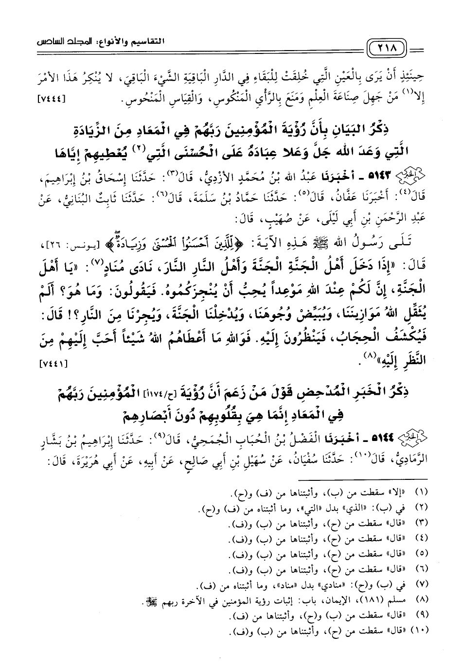 ذِكْرُ الْبَيَانِ بِأَنَّ رُؤْيَةَ الْمُؤْمِنِينَ رَبَّهَمْ فِي الْمَعَادِ مِنَ الزِّيَادَةِ الَّتِي وَعَدَ اللهُ جَلَّ وَعَلَا عِبَادَهُ عَلَى الْحُسْنَى الَّتِي يُعْطِيهِمْ إِيَّاهَا.