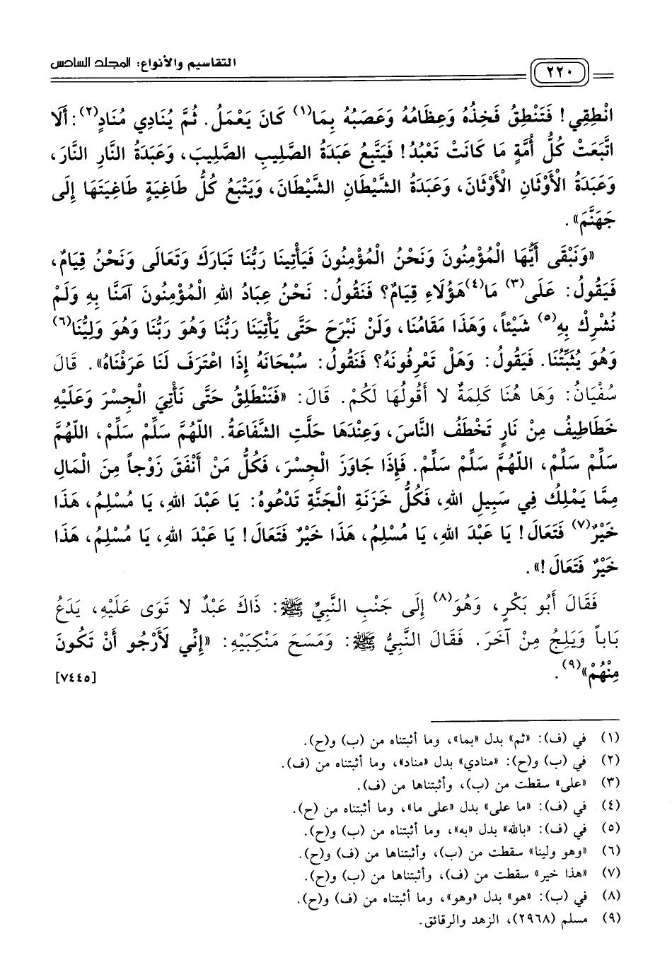 وَيَتْبَعُ كُلُّ طَاغِيَةٍ طَاغِيَتَهَا إِلَى جَهَنَّمَ، وَنَبْقَى أَيُّهَا الْمُؤْمِنُونَ، وَنَحْنُ الْمُؤْمِنُونَ فَيَأْتِينَا رَبُّنَا تَبَارَكَ وَتَعَالَى وَنَحْنُ قِيَامٌ، فَيَقُولُ: عَلَى مَا هَؤُلَاءِ قِيَامٌ؟ فَنَقُولُ: نَحْنُ عِبَادُ اللهِ الْمُؤْمِنُونَ آمَنَّا بِهِ، وَلَمْ نُشْرِكْ بِهِ شَيْئًا، وَهَذَا مَقَامُنَا، وَلَنْ نَبْرَحَ حَتَّى يَأْتِيَنَا رَبُّنَا، وَهُوَ رَبُّنَا وَهُوَ وَلِيُّنَا وَهُوَ يُثَبِّتُنَا، فَيَقُولُ: وَهَلْ تَعْرِفُونَهُ؟ فَنَقُولُ: سُبْحَانَهُ إِذَا اعْتَرَفَ لَنَا عَرَفْنَاهُ".