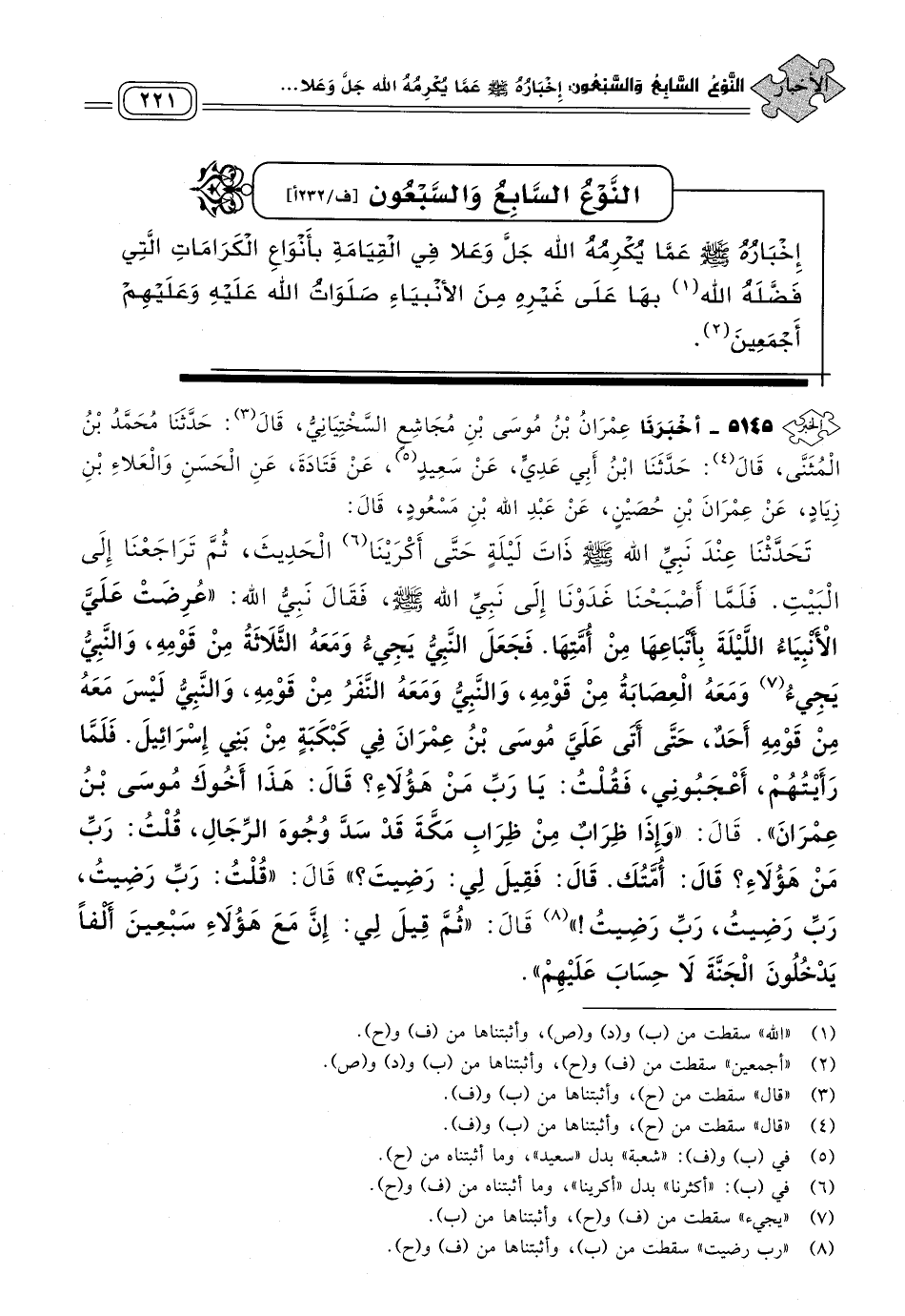 ٥١٤٥ - أَخبَرنا عِمْرَانُ بْنُ مُوسَى بْنِ مُجَاشِعٍ السَّخْتِيَانِيُّ، قَالَ: حَدثنا مُحَمَّدُ بْنُ الْمُثَنَّى، قَالَ: حَدثنا ابْنُ أَبِي عَدِيٍّ، عَنْ سَعِيدٍ، عَنْ قَتَادَةَ، عَنِ الْحَسَنِ، وَالْعَلَاءِ بْنِ زِيَادٍ، عَنْ عِمْرَانَ بْنِ حُصَيْنٍ، عَنْ عَبْدِ اللهِ بْنِ مَسْعُودٍ، قَالَ: تَحَدَّثْنَا عِنْدَ نَبِيِّ اللهِ صَلى الله عَلَيه وسَلم ذَاتَ لَيْلَةٍ حَتَّى أَكْرَيْنَا الْحَدِيثَ، ثُمَّ تَرَاجَعْنَا إِلَى الْبَيْتِ، فَلَمَّا أَصْبَحْنَا غَدَوْنَا إِلَى نَبِيِّ اللهِ صَلى الله عَلَيه وسَلم، فَقَالَ نَبِيُّ اللهِ: "عُرِضَتْ عَلَيَّ الأَنْبِيَاءُ اللَّيْلَةَ بِأَتْبَاعِهَا مِنْ أُمَّتِهَا، فَجَعَلَ النَّبِيُّ يَجِيءُ وَمَعَهُ الثَّلَاثَةُ مِنْ قَوْمِهِ، وَالنَّبِيُّ يَجِيءُ وَمَعَهُ الْعِصَابَةُ مِنْ قَوْمِهِ، وَالنَّبِيُّ وَمَعَهُ النَّفَرُ مِنْ قَوْمِهِ، وَالنَّبِيُّ لَيْسَ مَعَهُ مِنْ قَوْمِهِ أَحَدٌ، حَتَّى أَتَى عَلَيَّ مُوسَى بْنُ عِمْرَانَ فِي كَبْكَبَةٍ مِنْ بَنِي إِسْرَائِيلَ، فَلَمَّا رَأَيْتُهُمْ أَعْجَبُونِي، فَقُلْتُ: يَا رَبِّ، مَنْ هَؤُلَاءِ؟ قَالَ: هَذَا أَخُوكَ مُوسَى بْنُ عِمْرَانَ"، قَالَ: "وَإِذَا ظِرَابٌ مِنْ ظِرَابِ مَكَّةَ قَدْ سَدَّ وُجُوهَ الرِّجَالِ، قُلْتُ: رَبِّ، مَنْ هَؤُلَاءِ؟ قَالَ: أُمَّتُكَ، قَالَ: فَقِيلَ لِي: رَضِيتَ؟ " قَالَ: "قُلْتُ: رَبِّ رَضِيتُ، رَبِّ رَضِيتُ، رَبِّ رَضِيتُ" قَالَ: "ثُمَّ قِيلَ لِي: إِنَّ مَعَ هَؤُلَاءِ سَبْعِينَ أَلْفًا يَدْخُلُونَ الْجَنَّةَ لَا حِسَابَ عَلَيْهِمْ"، قَالَ: فَأَنْشَأَ عُكَّاشَةُ بْنُ مِحْصَنٍ أَخُو بَنِي أَسَدِ بْنِ خُزَيْمَةَ، فَقَالَ: يَا نَبِيَّ اللهِ، ادْعُ رَبَّكَ أَنْ يَجْعَلَنِي مِنْهُمْ.
