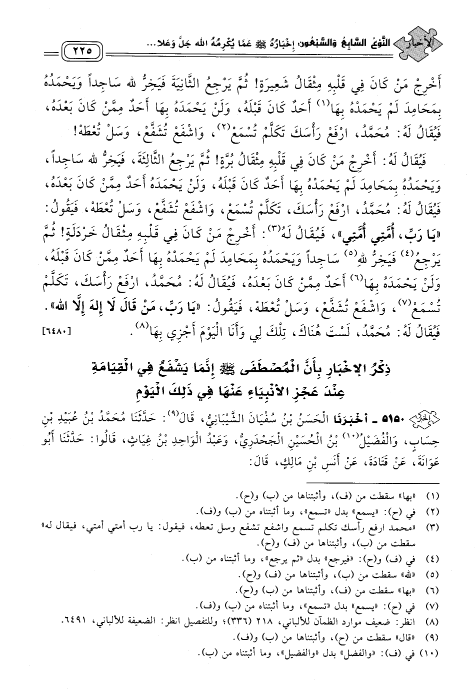 فَيُقَالُ لَهُ: مُحَمَّدُ، ارْفَعْ رَأْسَكَ، تَكَلَّمْ تُسْمَعْ، وَاشْفَعْ تُشَفَّعْ، وَسَلْ تُعْطَهْ، فَيَقُولُ: "يَا رَبِّ، أُمَّتِي أُمَّتِي"، فَيُقَالُ: أَخْرِجْ مَنْ كَانَ فِي قَلْبِهِ مِثْقَالُ شَعِيرَةٍ، ثُمَّ يَرْجِعُ الثَّانِيَةَ، فَيَخِرُّ للهِ سَاجِدًا وَيَحْمَدُهُ بِمَحَامِدَ لَمْ يَحْمَدْهُ بها أَحَدٌ كَانَ قَبْلَهُ، وَلَنْ يَحْمَدَهُ بِهَا أَحَدٌ مِمَّنْ كَانَ بَعْدَهُ، فَيُقَالُ لَهُ: مُحَمَّدُ، ارْفَعْ رَأْسَكَ، تَكَلَّمْ تُسْمَعْ، وَاشْفَعْ تُشَفَّعْ، وَسَلْ تُعْطَهْ، فَيُقَالُ لَهُ: أَخْرِجْ مَنْ كَانَ فِي قَلْبِهِ مِثْقَالُ بُرَّةٍ، ثُمَّ يَرْجِعُ الثَّالِثَةَ، فَيَخِرُّ للهِ سَاجِدًا، وَيَحْمَدُهُ بِمَحَامِدَ لَمْ يَحْمَدْهُ بِهَا أَحَدٌ كَانَ قَبْلَهُ، وَلَنْ يَحْمَدَهُ أَحَدٌ مِمَّنْ كَانَ بَعْدَهُ، فَيُقَالُ لَهُ: مُحَمَّدُ، ارْفَعْ رَأْسَكَ، تَكَلَّمْ تُسْمَعْ، وَاشْفَعْ تُشَفَّعْ، وَسَلْ تُعْطَهْ، فَيَقُولُ: "يَا رَبِّ، أُمَّتِي أُمَّتِي"، فَيُقَالُ لَهُ: أَخْرِجْ مَنْ كَانَ فِي قَلْبِهِ مِثْقَالُ خَرْدَلَةٍ، ثُمَّ يَرْجِعُ، فَيَخِرُّ للهِ سَاجِدًا، وَيَحْمَدُهُ بِمَحَامِدَ لَمْ يَحْمَدْهُ بِهَا أَحَدٌ مِمَّنْ كَانَ قَبْلَهُ، وَلَنْ يَحْمَدَهُ بِهَا أَحَدٌ مِمَّنْ كَانَ بَعْدَهُ، فَيُقَالُ لَهُ: مُحَمَّدُ، ارْفَعْ رَأْسَكَ، تَكَلَّمْ تُسْمَعْ، وَاشْفَعْ تُشَفَّعْ، وَسَلْ تُعْطَهْ، فَيَقُولُ: "يَا رَبِّ، مَنْ قَالَ لَا إِلَهَ إِلَاّ اللهُ"، فَيُقَالُ لَهُ: مُحَمَّدُ، لَسْتَ هُنَاكَ، تِلْكَ لِي وَأَنَا الْيَوْمَ أَجْزِي بِهَا. [٦٤٨٠]