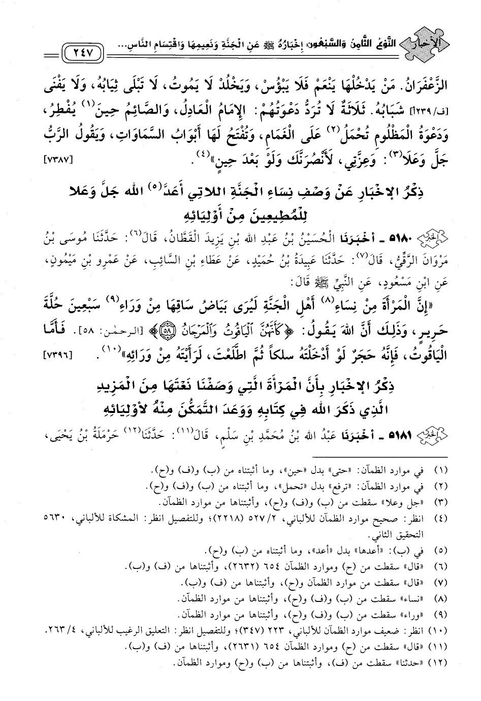 ٥١٨١ - أَخبَرنا عَبْدُ اللهِ بْنُ مُحَمَّدِ بْنِ سَلْمٍ، قَالَ: حَدثنا حَرْمَلَةُ بْنُ يَحْيَى، قَالَ: حَدثنا ابْنُ وَهْبٍ، قَالَ: أَخْبَرَنِي عَمْرُو بْنُ الْحَارِثِ، أَنَّ دَرَّاجًا حَدَّثَهُ، عَنْ أَبِي الْهَيْثَمِ، عَنْ أَبِي سَعِيدٍ الْخُدْرِيِّ، أَنَّهُ قَالَ: قَالَ رَسُولُ اللهِ صَلى الله عَلَيه وسَلم: "إِنَّ الرَّجُلَ فِي الْجَنَّةِ لَيَتَّكِئُ سَبْعِينَ سَنَةً قَبْلَ أَنْ يَتَحَوَّلَ، ثُمَّ تَأْتِيهِ الْمَرْأَةُ فَتَقْرُبُ مِنْهُ، فَيَنْظُرُ فِي خَدِّهَا أَصْفَى مِنَ الْمِرْآةِ، فَتُسَلِّمُ عَلَيْهِ فَيَرُدُّ السَّلَامَ، وَيَسْأَلُهَا: مَنْ أَنْتِ؟ فَتَقُولُ: أَنَا مِنَ الْمَزِيدِ، وَإِنَّهُ يَكُونُ عَلَيْهَا سَبْعُونَ ثَوْبًا، فَيَنْفُذُهَا بَصَرُهُ حَتَّى يَرَى مُخَّ سَاقِهَا مِنْ وَرَاءِ ذَلِكَ، وَإِنَّ عَلَيْهِنَّ التِّيجَانَ، وَإِنَّ أَدْنَى لُؤْلُؤَةٍ عَلَيْهَا لَتُضِيءُ مَا بَيْنَ الْمَشْرِقِ وَالْمَغْرِبِ". [٧٣٩٧]