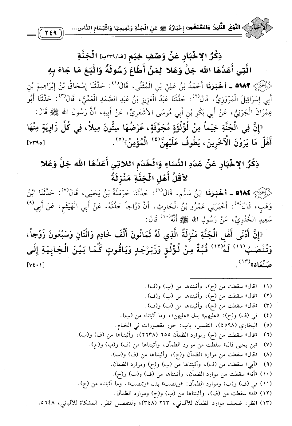 ٥١٨٣ - أَخبَرنا أَحْمَدُ بْنُ عَلِيِّ بْنِ الْمُثَنَّى، قَالَ: حَدثنا إِسْحَاقُ بْنُ إِبْرَاهِيمَ بْنِ أَبِي إِسْرَائِيلَ الْمَرْوَزِيُّ، قَالَ: حَدثنا عَبْدُ الْعَزِيزِ بْنُ عَبْدِ الصَّمَدِ الْعَمِّيُّ، قَالَ: حَدثنا أَبُو عِمْرَانَ الْجَوْنِيُّ، عَنْ أَبِي بَكْرِ بْنِ أَبِي مُوسَى الأَشْعَرِيِّ، عَنْ أَبِيهِ، أَنَّ رَسُولَ اللهِ صَلى الله عَلَيه وسَلم قَالَ: "إِنَّ فِيَ الْجَنَّةِ خِيَمًا مِنْ لُؤْلُؤَةٍ مُجَوَّفَةٍ، عَرْضُهَا سِتُّونَ مِيلاً، فِي كُلِّ زَاوِيَةٍ مِنْهَا أَهْلٌ مَا يَرَوْنَ الآخَرِينَ، يَطُوفُ عَلَيْهِنَّ الْمُؤْمِنُ". [٧٣٩٥]