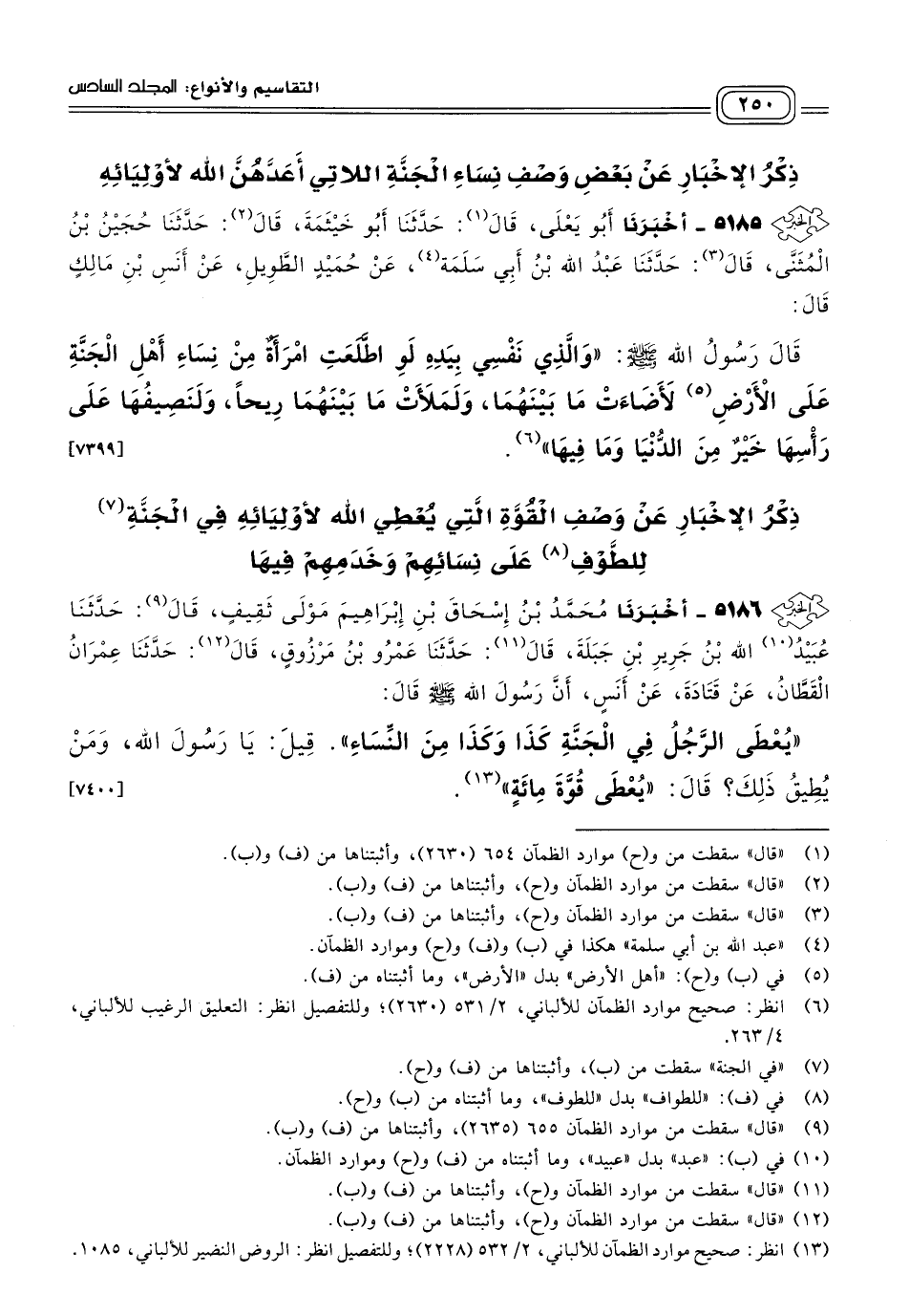 ٥١٨٦ - أَخبَرنا مُحَمَّدُ بْنُ إِسْحَاقَ بْنِ إِبْرَاهِيمَ مَوْلَى ثَقِيفٍ، قَالَ: حَدثنا عُبَيْدُ اللهِ بْنُ جَرِيرِ بْنِ جَبَلَةَ، قَالَ: حَدثنا عَمْرُو بْنُ مَرْزُوقٍ، قَالَ: حَدثنا عِمْرَانُ الْقَطَّانُ، عَنْ قَتَادَةَ، عَنْ أَنَسٍ، أَنَّ رَسُولَ اللهِ صَلى الله عَلَيه وسَلم قَالَ: "يُعْطَى الرَّجُلُ فِي الْجَنَّةِ كَذَا وَكَذَا مِنَ النِّسَاءِ"، قِيلَ: يَا رَسُولَ اللهِ، وَمَنْ يُطِيقُ ذَلِكَ؟ قَالَ: "يُعْطَى قُوَّةَ مِائَةٍ". [٧٤٠٠]
