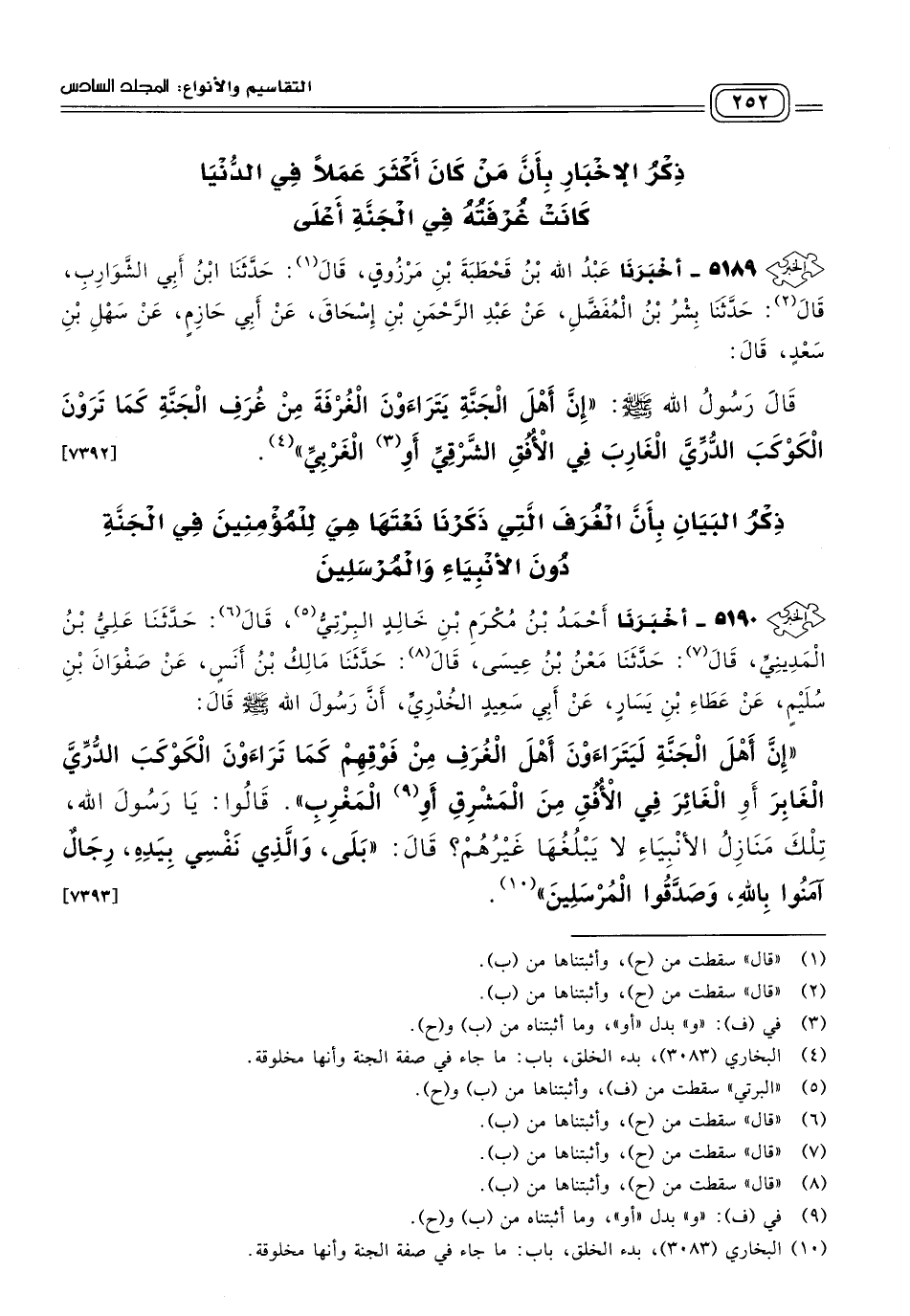 ٥١٩٠ - أَخبَرنا أَحْمَدُ بْنُ مُكْرَمِ بْنِ خَالِدٍ الْبِرْتِيُّ، قَالَ: حَدثنا عَلِيُّ بْنُ الْمَدِينِيِّ، قَالَ: حَدثنا مَعْنُ بْنُ عِيسَى، قَالَ: حَدثنا مَالِكُ بْنُ أَنَسٍ، عَنْ صَفْوَانَ بْنِ سُلَيْمٍ، عَنْ عَطَاءِ بْنِ يَسَارٍ، عَنْ أَبِي سَعِيدٍ الْخُدْرِيِّ، أَنَّ رَسُولَ اللهِ صَلى الله عَلَيه وسَلم قَالَ: "إِنَّ أَهْلَ الْجَنَّةِ لَيَتَرَاءَوْنَ أَهْلَ الْغُرَفِ مِنْ فَوْقِهِمْ، كَمَا تَرَاءَوْنَ الْكَوْكَبَ الدُّرِّيَّ الْغَابِرَ، أَوِ الْغَائِرَ فِي الأُفُقِ مِنَ الْمَشْرِقِ أَوِ الْمَغْرِبِ"، قَالُوا: يَا رَسُولَ اللهِ، تِلْكَ مَنَازِلُ الأَنْبِيَاءِ لَا يَبْلُغُهَا غَيْرُهُمْ؟ قَالَ: "بَلَى وَالَّذِي نَفْسِي بِيَدِهِ، رِجَالٌ آمَنُوا بِاللهِ وَصَدَّقُوا الْمُرْسَلِينَ". [٧٣٩٣]