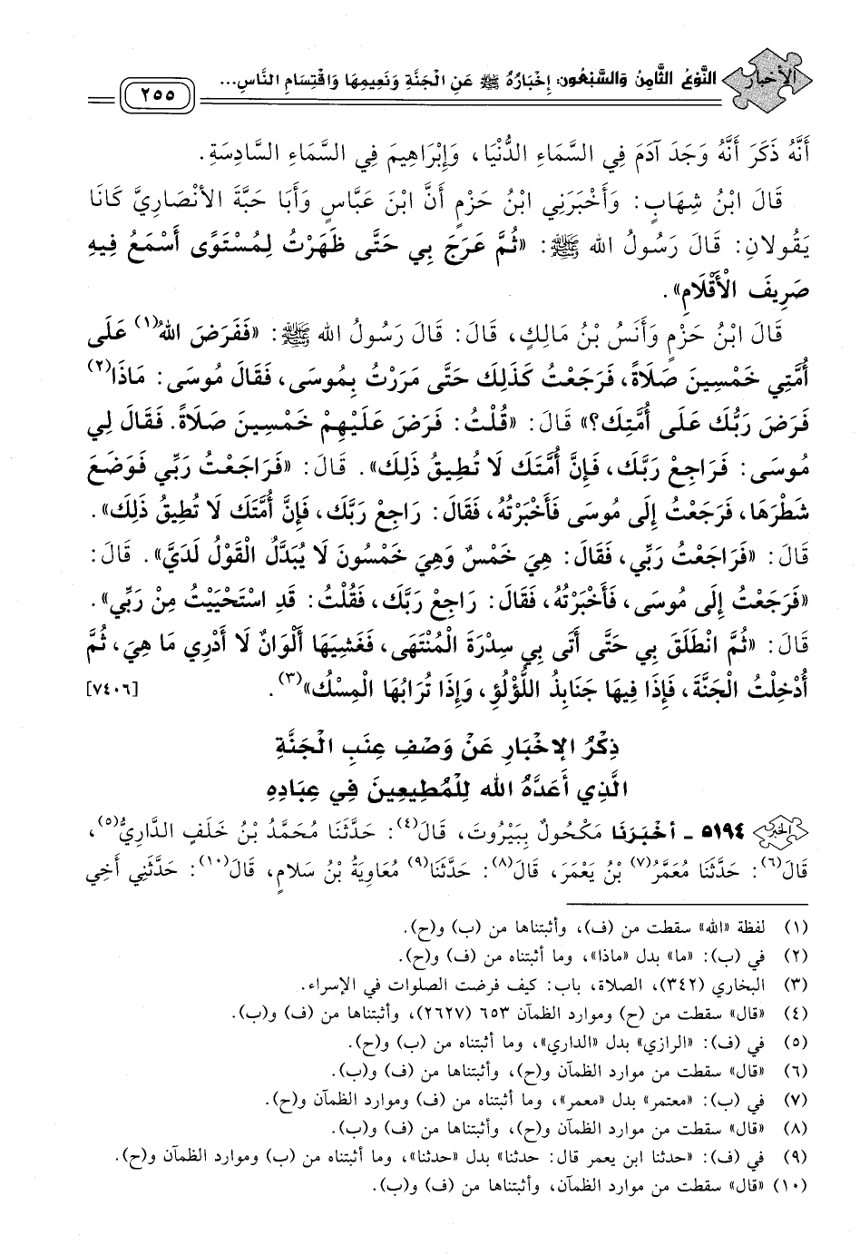قَالَ ابْنُ حَزْمٍ، وَأَنَسُ بْنُ مَالِكٍ، قَالَ: قَالَ رَسُولُ اللهِ صَلى الله عَلَيه وسَلم: "فَفَرَضَ اللهُ عَلَى أُمَّتِي خَمْسِينَ صَلَاةً، فَرَجَعْتُ كَذَلِكَ حَتَّى مَرَرْتُ بِمُوسَى، فَقَالَ مُوسَى: مَاذا فَرَضَ رَبُّكَ عَلَى أُمَّتِكَ؟ " قَالَ: "قُلْتُ: فَرَضَ عَلَيْهِمْ خَمْسِينَ صَلَاةً، فَقَالَ لِي مُوسَى: فَرَاجِعْ رَبَّكَ فَإِنَّ أُمَّتَكَ لَا تُطِيقُ ذَلِكَ"، قَالَ: "فَرَاجَعْتُ رَبِّي، فَوَضَعَ شَطْرَهَا، فَرَجَعْتُ إِلَى مُوسَى فَأَخْبَرْتُهُ، فَقَالَ: رَاجِعْ رَبَّكَ، فَإِنَّ أُمَّتَكَ لَا تُطِيقُ ذَلِكَ"، قَالَ: "فَرَاجَعْتُ رَبِّي، فَقَالَ: هِيَ خَمْسٌ وَهِيَ خَمْسُونَ لَا يُبَدَّلُ الْقَوْلُ لَدَيَّ"، قَالَ: "فَرَجَعْتُ إِلَى مُوسَى، فَأَخْبَرْتُهُ، فَقَالَ: رَاجِعْ رَبَّكَ، فَقُلْتُ: قَدِ اسْتَحْيَيْتُ مِنْ رَبِّي"، قَالَ: "ثُمَّ انْطَلَقَ بِي حَتَّى أَتَى بِي سِدْرَةَ الْمُنْتَهَى، فَغَشِيَهَا أَلْوَانٌ لَا أَدْرِي مَا هِيَ، ثُمَّ أُدْخِلْتُ الْجَنَّةَ، فَإِذَا فِيهَا جَنَابِذُ اللُّؤْلُؤِ، وَإِذَا تُرَابُهَا الْمِسْكُ". [٧٤٠٦]