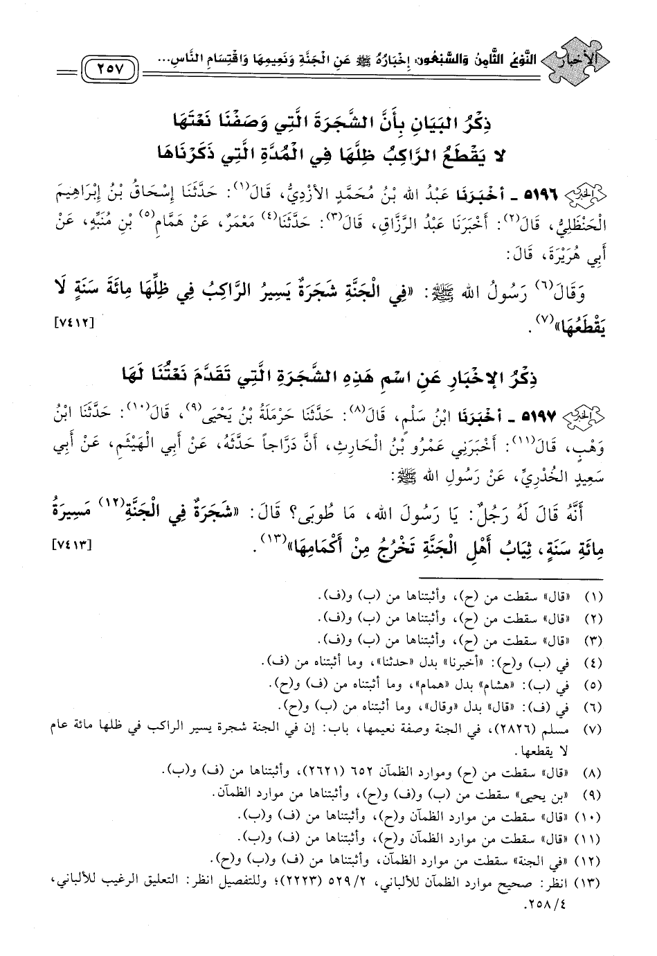٥١٩٦ - أَخبَرنا عَبْدُ اللهِ بْنُ مُحَمَّدٍ الأَزْدِيُّ، قَالَ: حَدثنا إِسْحَاقُ بْنُ إِبْرَاهِيمَ الْحَنْظَلِيُّ، قَالَ: أَخبَرنا عَبْدُ الرَّزَّاقِ، قَالَ: حدثنا مَعْمَرٌ، عَنْ هَمَّامِ بْنِ مُنَبِّهٍ، عَنْ أَبِي هُرَيْرَةَ، قَالَ: وَقَالَ رَسُولُ اللهِ صَلى الله عَلَيه وسَلم: "فِي الْجَنَّةِ شَجَرَةٌ يَسِيرُ الرَّاكِبُ فِي ظِلِّهَا مِائَةَ سَنَةٍ لَا يَقْطَعُهَا". [٧٤١٢]