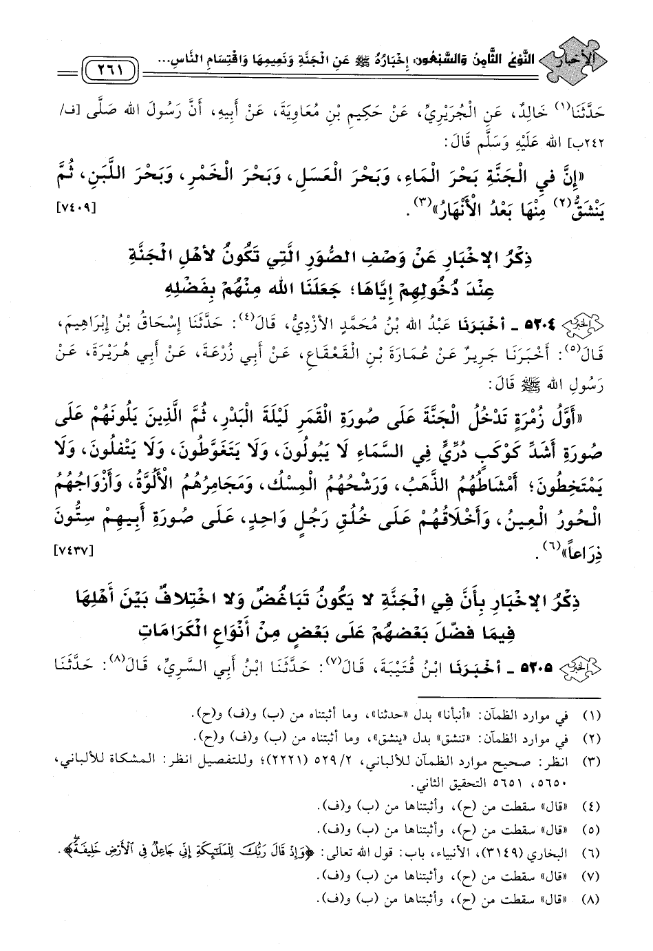 ٥٢٠٤ - أَخبَرنا عَبْدُ اللهِ بْنُ مُحَمَّدٍ الأَزْدِيُّ، قَالَ: حَدثنا إِسْحَاقُ بْنُ إِبْرَاهِيمَ، قَالَ: أَخبَرنا جَرِيرٌ، عَنْ عُمَارَةَ بْنِ الْقَعْقَاعِ، عَنْ أَبِي زُرْعَةَ، عَنْ أَبِي هُرَيْرَةَ، عَنْ رَسُولِ اللهِ صَلى الله عَلَيه وسَلم قَالَ: "أَوَّلُ زُمْرَةٍ تَدْخُلُ الْجَنَّةَ عَلَى صُورَةِ الْقَمَرِ لَيْلَةَ الْبَدْرِ، ثُمَّ الَّذِينَ يَلُونَهُمْ عَلَى صُورَةِ أَشَدِّ كَوْكَبٍ دُرِّيٍّ فِي السَّمَاءِ، لَا يَبُولُونَ، وَلَا يَتَغَوَّطُونَ، وَلَا يَتْفُلُونَ، وَلَا يَمْتَخِطُونَ، أمْشَاطُهُمُ الذَّهَبُ، وَرَشْحُهُمُ الْمِسْكُ، وَمَجَامِرُهُمُ الأَلُوَّةُ، وَأَزْوَاجُهُمُ الْحُورُ الْعِيْنُ، وَأَخْلَاقُهُمْ عَلَى خُلُقِ رَجُلٍ وَاحِدٍ، عَلَى صُورَةِ أَبِيهِمْ سِتُّونَ ذِرَاعًا". [٧٤٣٧]