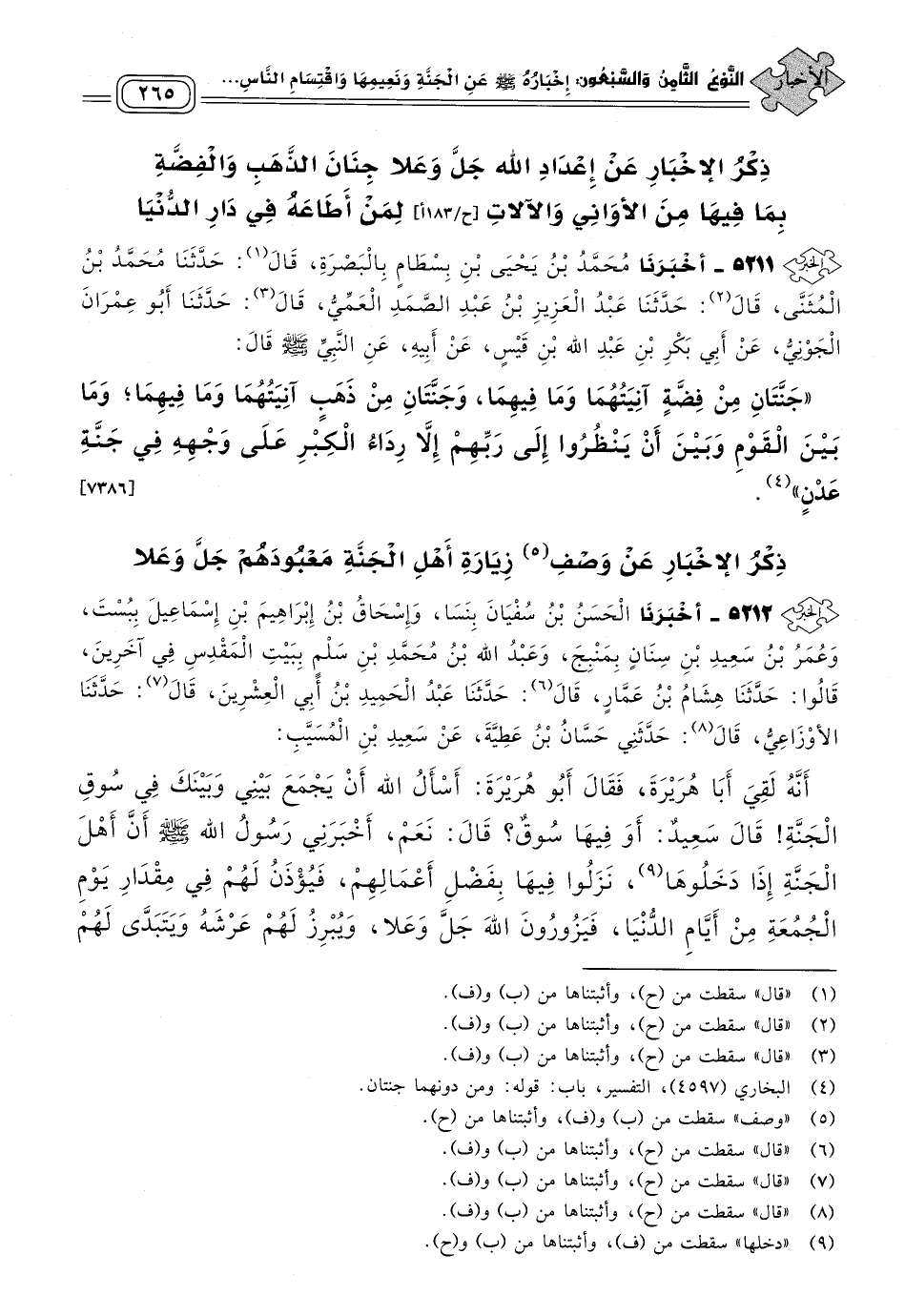 ٥٢١٢ - أَخبَرنا الْحَسَنُ بْنُ سُفْيَانَ، بِنَسَا، وَإِسْحَاقُ بْنُ إِبْرَاهِيمَ بْنِ إِسْمَاعِيلَ، بِبُسْتَ، وَعُمَرُ بْنُ سَعِيدِ بْنِ سِنَانٍ، بِمَنْبِجَ، وَعَبْدُ اللهِ بْنُ مُحَمَّدِ بْنِ سَلْمٍ، بِبَيْتِ الْمَقْدِسِ فِي آخَرِينَ، قَالُوا: حَدثنا هِشَامُ بْنُ عَمَّارٍ، قَالَ: حَدثنا عَبْدُ الْحَمِيدِ بْنُ أَبِي الْعِشْرِينَ، قَالَ: حَدثنا الأَوْزَاعِيُّ، قَالَ: حَدَّثَنِي حَسَّانُ بْنُ عَطِيَّةَ، عَنْ سَعِيدِ بْنِ الْمُسَيَّبِ، أَنَّهُ لَقِيَ أَبَا هُرَيْرَةَ، فَقَالَ أَبُو هُرَيْرَةَ: أَسْأَلُ اللهَ أَنْ يَجْمَعَ بَيْنِي وَبَيْنَكَ فِي سُوقِ الْجَنَّةِ، قَالَ سَعِيدٌ: أَوَ فِيهَا سُوقٌ؟ قَالَ: نَعَمْ، أَخْبَرَنِي رَسُولُ اللهِ صَلى الله عَلَيه وسَلم أَنَّ أَهْلَ الْجَنَّةِ إِذَا دَخَلُوهَا نَزَلُوا فِيهَا بِفَضْلِ أَعْمَالِهِمْ، فَيُؤْذَنُ لَهُمْ فِي مِقْدَارِ يَوْمِ الْجُمُعَةِ مِنْ أَيَّامِ الدُّنْيَا، فَيَزُورُونَ اللهَ جَلَّ وَعَلَا، وَيُبْرِزُ لَهُمْ عَرْشَهُ وَيتَبَدَّى لَهُمْ فِي رَوْضَةٍ مِنْ رِيَاضِ الْجَنَّةِ،