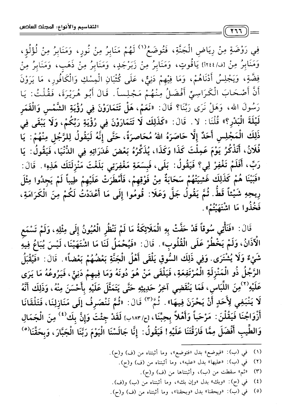 ثُمَّ يَقُولُ جَلَّ وَعَلَا: قُومُوا إِلَى مَا أَعْدَدْتُ لَكُمْ مِنَ الْكَرَامَةِ، فَخُذُوا مَا اشْتَهَيْتُمْ". قَالَ: "فَنَأْتِي سُوقًا قَدْ حَفَّتْ بِهِ الْمَلَائِكَةُ مَا لَمْ تَنْظُرِ الْعُيُونُ إِلَى مِثْلِهِ، وَلَمْ تَسْمَعِ الآذَانُ، وَلَمْ يَخْطُرْ عَلَى الْقُلُوبِ"، قَالَ: "فَيُحْمَلُ لَنَا مَا اشْتَهَيْنَا، لَيْسَ يُبَاعُ فِيهِ شَيْءٌ وَلَا يُشْتَرَى، وَفِي ذَلِكَ السُّوقِ يَلْقَى أَهْلُ الْجَنَّةِ بَعْضُهُمْ بَعْضًا"، قَالَ: "فَيُقْبِلُ الرَّجُلُ ذُو الْمَنْزِلَةِ الْمُرْتَفِعَةِ، فَيَلْقَى مَنْ هُوَ دُونَهُ، وَمَا فِيهِمْ دَنِيٌّ، فَيَرُوعُهُ مَا يَرَى عَلَيْهِ مِنَ اللِّبَاسِ، فَمَا يَنْقَضِي آخِرُ حَدِيثِهِ حَتَّى يَتَمَثَّلَ عَلَيْهِ بِأَحْسَنَ مِنْهُ، وَذَلِكَ أَنَّهُ لَا يَنْبَغِي لأَحَدٍ أَنْ يَحْزَنَ فِيهَا"، ثم قَالَ: "ثُمَّ نَنْصَرِفُ إِلَى مَنَازِلِنَا، فَتَلْقَانَا أَزْوَاجُنَا، فَيَقُلْنَ: مَرْحَبًا وَأَهْلاً بِحِبِّنَا، لَقَدْ جِئْتَ وَإِنَّ بِكَ مِنَ الْجَمَالِ وَالطِّيبِ أَفْضَلَ مِمَّا فَارَقْتَنَا عَلَيْهِ، فَيَقُولُ: إِنَّا جَالَسْنَا الْيَوْمَ رَبَّنَا الْجَبَّارَ، وَبِحَقِّنَا أَنْ نَنْقَلِبَ بِمِثْلِ مَا انْقَلَبْنَا".