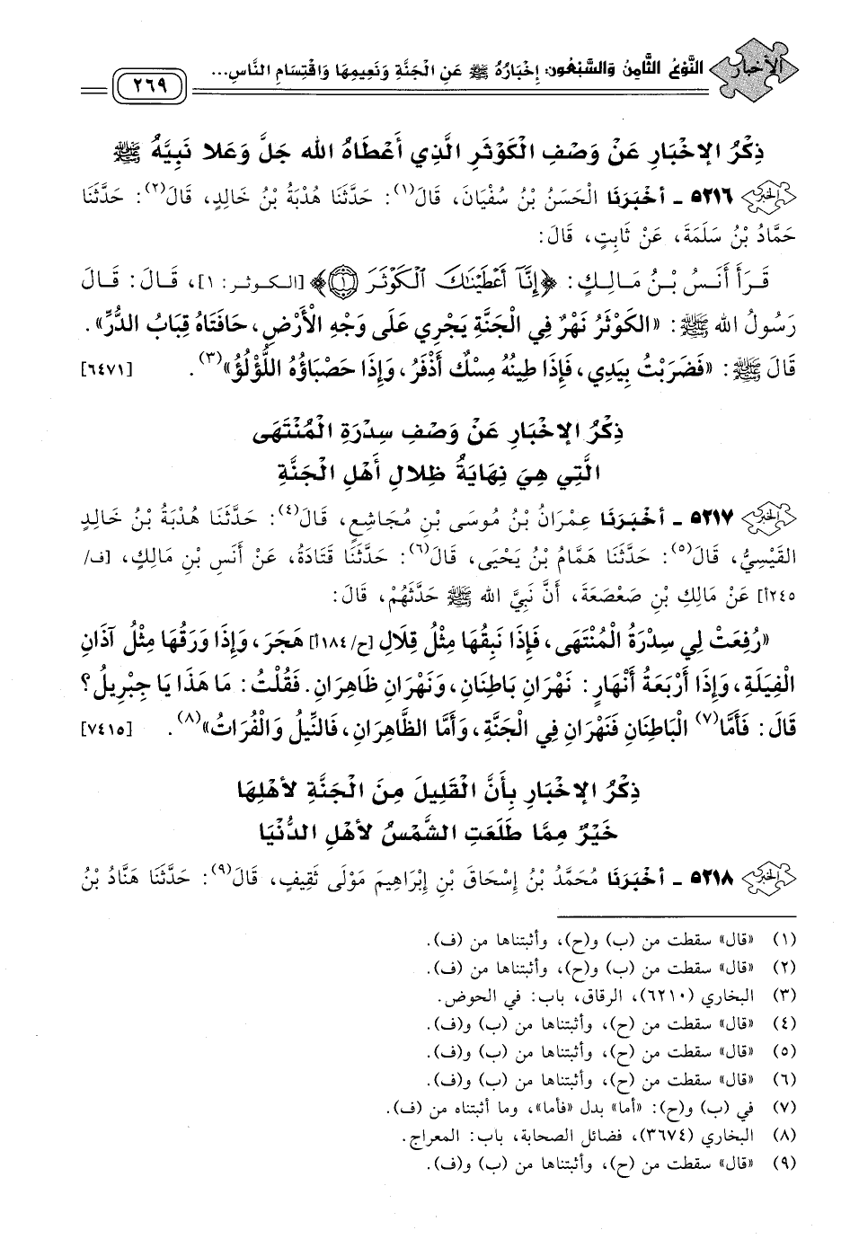 ٥٢١٦ - أَخبَرنا الْحَسَنُ بْنُ سُفْيَانَ، قال: حَدثنا هُدْبَةُ بْنُ خَالِدٍ، قال: حَدثنا حَمَّادُ بْنُ سَلَمَةَ، عَنْ ثَابِتٍ، قَالَ: قَرَأَ أَنَسُ بْنُ مَالِكٍ: {إِنَّا أَعْطَيْنَاكَ الْكَوْثَرَ} [الكوثر: ١]، قَالَ: قَالَ رَسُولُ اللهِ صَلى الله عَلَيه وسَلم: "الْكَوْثَرُ نَهَرٌ فِي الْجَنَّةِ يَجْرِي عَلَى وَجْهِ الأَرْضِ، حَافَّتَاهُ قِبَابُ الدُّرِّ"، قَالَ صَلى الله عَلَيه وسَلم: "فَضَرَبْتُ بِيَدِي، فَإِذَا طِينُهُ مِسْكٌ أَذْفَرُ، وَإِذَا حَصْبَاؤُهُ اللُّؤْلُؤُ". [٦٤٧١]