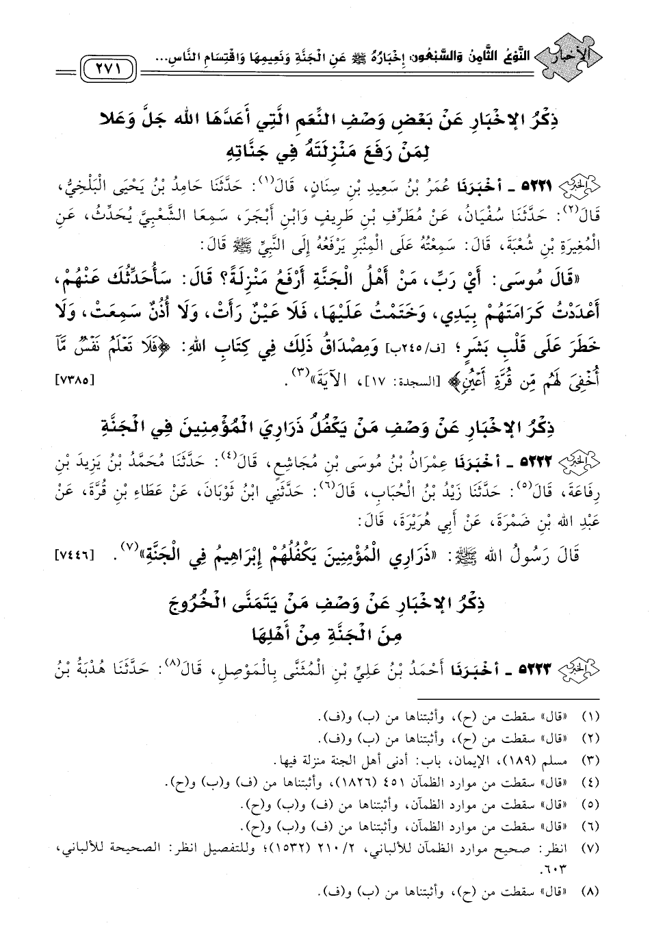 ٥٢٢١ - أَخبَرنا عُمَرُ بْنُ سَعِيدِ بْنِ سِنَانٍ، قَالَ: حَدثنا حَامِدُ بْنُ يَحْيَى الْبَلْخِيُّ، قَالَ: حَدثنا سُفْيَانُ، عَنْ مُطَرِّفِ بْنِ طَرِيفٍ، وَابْنِ أَبْجَرَ، سَمِعَا الشَّعْبِيَّ يُحَدِّثُ، عَنِ الْمُغِيرَةِ بْنِ شُعْبَةَ، قَالَ: سَمِعْتُهُ عَلَى الْمِنْبَرِ يَرْفَعُهُ إِلَى النَّبِيِّ صَلى الله عَلَيه وسَلم، قَالَ: "قَالَ مُوسَى: أَيْ رَبِّ، مَنْ أَهْلُ الْجَنَّةِ أَرْفَعُ مَنْزِلَةً؟ قَالَ: سَأُحَدِّثُكَ عَنْهُمْ، أَعْدَدْتُ كَرَامَتَهُمْ بِيَدِي، وَخَتَمْتُ عَلَيْهَا، فَلَا عَيْنٌ رَأَتْ، وَلَا أُذُنٌ سَمِعَتْ، وَلَا خَطَرَ عَلَى قَلْبِ بَشَرٍ، وَمِصْدَاقُ ذَلِكَ فِي كِتَابِ اللهِ: {فَلَا تَعْلَمُ نَفْسٌ مَا أُخْفِيَ لَهُمْ مِنْ قُرَّةِ أَعْيُنٍ} [السجدة: ١٧]، الآيَةَ". [٧٣٨٥]