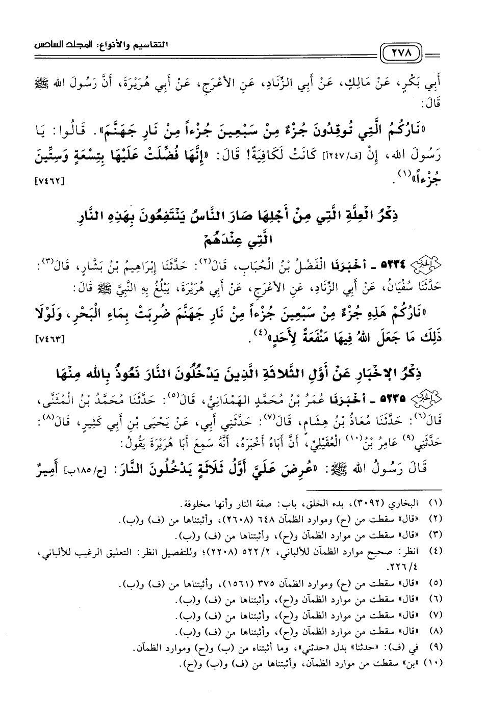 ٥٢٣٤ - أَخبَرنا الْفَضْلُ بْنُ الْحُبَابِ، قَالَ: حَدثنا إِبْرَاهِيمُ بْنُ بَشَّارٍ، قَالَ: حَدثنا سُفْيَانُ، عَنْ أَبِي الزِّنَادِ، عَنِ الأَعْرَجِ، عَنْ أَبِي هُرَيْرَةَ، يَبْلُغُ بِهِ النَّبِيَّ صَلى الله عَلَيه وسَلم قَالَ: "نَارُكُمْ هَذِهِ جُزْءٌ مِنْ سَبْعِينَ جُزْءًا مِنْ نَارِ جَهَنَّمَ ضُرِبَتْ بِمَاءِ الْبَحْرِ، وَلَوْلَا ذَلِكَ مَا جَعَلَ اللهُ فِيهَا مَنْفَعَةً لأَحَدٍ". [٧٤٦٣]