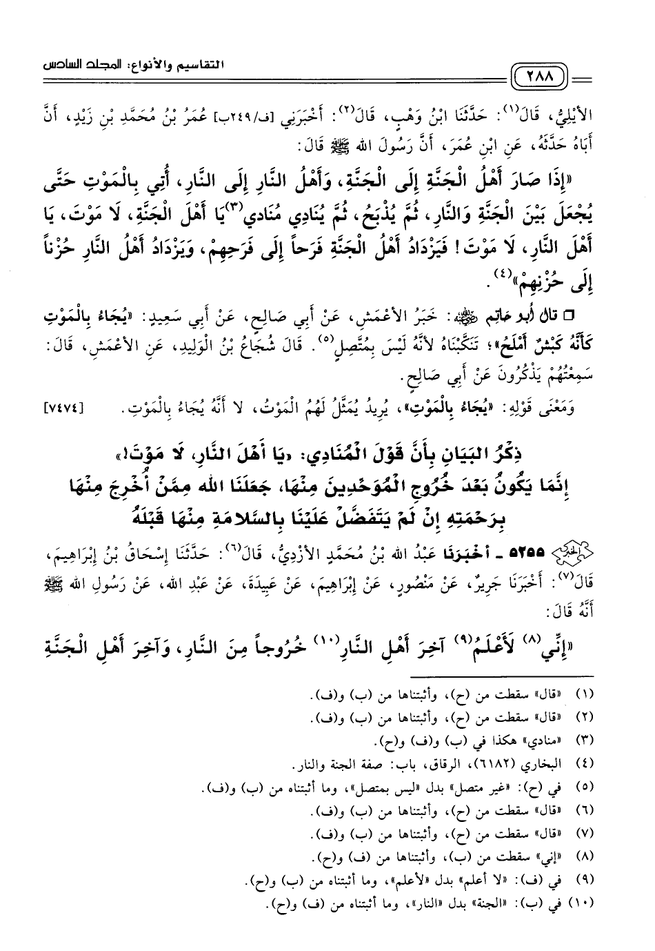 ذِكْرُ الْبَيَانِ بِأَنَّ قَوْلَ الْمُنَادِي: "يَا أَهْلَ النَّارِ لَا مَوْتَ" إِنَّمَا يَكُونُ بَعْدَ خُرُوجِ الْمُوَحِّدِينَ مِنْهَا، جَعَلْنَا اللهُ مِمَّنْ أُخْرِجَ مِنْهَا بِرَحْمَتِهِ إِنْ لَمْ يَتَفَضَّلْ عَلَيْنَا بِالسَّلَامَةِ مِنْهَا قَبْلَهُ.