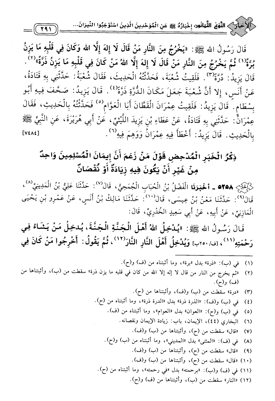 ذِكْرُ الْخَبَرِ الْمُدْحِضِ قَوْلَ مَنْ زَعَمَ أَنَّ إِيمَانَ الْمُسْلِمِينَ وَاحِدٌ مِنْ غَيْرِ أَنْ يَكُونَ فِيهِ زِيَادَةٌ أَوْ نُقْصَانٌ.