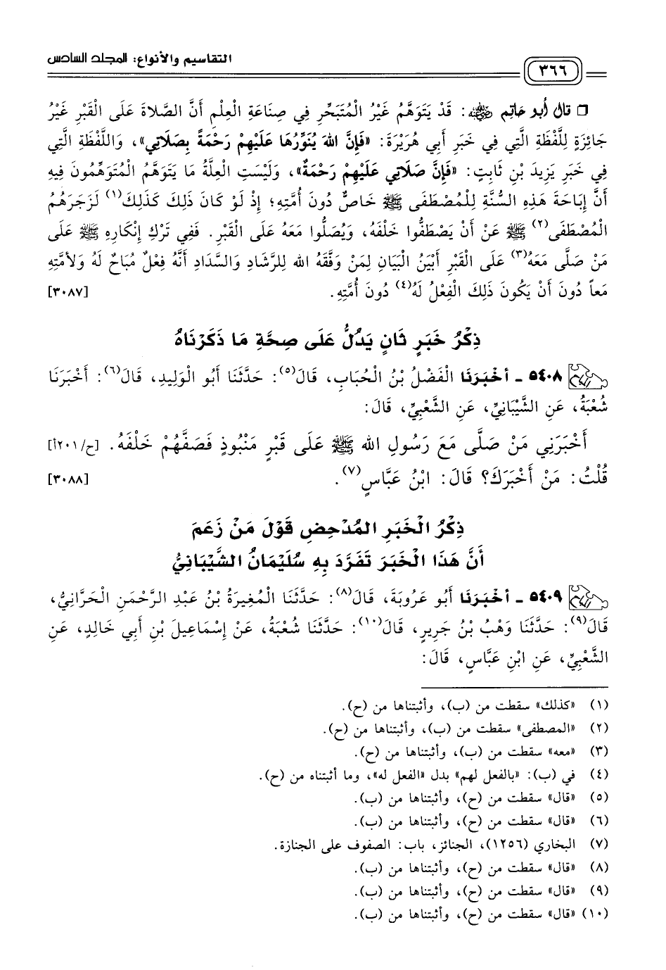 قَالَ أَبُو حَاتِمٍ رَضِيَ اللهُ عَنْهُ: قَدْ يَتَوَهَّمُ غَيْرُ الْمُتَبَحِّرِ فِي صِنَاعَةِ الْعِلْمِ أَنَّ الصَّلَاةَ عَلَى الْقَبْرِ غَيْرُ جَائِزَةٍ لِلَّفْظَةِ الَّتِي فِي خَبَرِ أَبِي هُرَيْرَةَ: "فَإِنَّ اللهَ يُنَوِّرُهَا عَلَيْهِمْ رَحْمَةً بِصَلَاتِي"، وَاللَّفْظَةِ الَّتِي فِي خَبَرِ يَزِيدَ بْنِ ثَابِتٍ: "فَإِنَّ صَلَاتِي عَلَيْهِمْ رَحْمَةٌ"، وَلَيْسَتِ الْعِلَّةُ مَا يَتَوَهَّمُ الْمُتَوَهِّمُونَ فِيهِ أَنَّ إِبَاحَةَ هَذِهِ السُّنَّةِ لِلْمُصْطَفَى صَلى الله عَلَيه وسَلم خَاصٌّ دُونَ أُمَّتِهِ، إِذْ لَوْ كَانَ ذَلِكَ كَذَلِكَ لَزَجَرَهُمُ الْمُصْطَفَى صَلى الله عَلَيه وسَلم عَنْ أَنْ يَصْطَفُّوا خَلْفَهُ، وَيُصَلُّوا مَعَهُ عَلَى الْقَبْرِ، فَفِي تَرْكِ إِنْكَارِهِ صَلى الله عَلَيه وسَلم عَلَى مَنْ صَلَّى معه عَلَى الْقَبْرِ أَبْيَنُ الْبَيَانِ لِمَنْ وَفَّقَهُ اللهُ لِلرَّشَادِ وَالسَّدَادِ أَنَّهُ فِعْلٌ مُبَاحٌ لَهُ وَلأُمَّتِهِ مَعًا دُونَ أَنْ يَكُونَ ذَلِكَ الْفِعْلُ لَهُ دُونَ أُمَّتِهِ. [٣٠٨٧]
