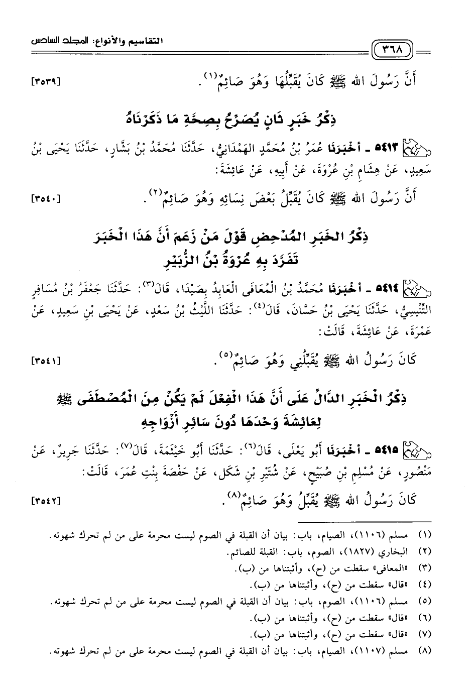 ٥٤١٣ - أَخبَرنا عُمَرُ بْنُ مُحَمَّدٍ الْهَمْدَانِيُّ، حَدثنا مُحَمَّدُ بْنُ بَشَّارٍ، حَدثنا يَحْيَى بْنُ سَعِيدٍ، عَنْ هِشَامِ بْنِ عُرْوَةَ، عَنْ أَبِيهِ، عَنْ عَائِشَةَ؛ أَنَّ رَسُولَ اللهِ صَلى الله عَلَيه وسَلم كَانَ يُقَبِّلُ بَعْضَ نِسَائِهِ وَهُوَ صَائِمٌ. [٣٥٤٠]