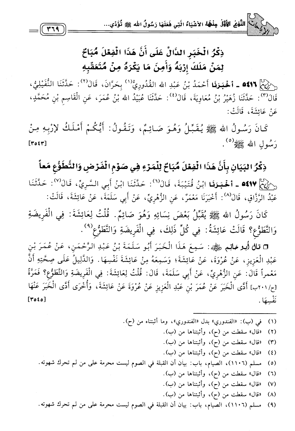 ٥٤١٦ - أَخبَرنا أَحْمَدُ بْنُ عَبْدِ اللهِ الْقُدُورِيُّ، بِحَرَّانَ، قَالَ: حَدثنا النُّفَيْلِيُّ، قَالَ: حَدثنا زُهَيْرُ بْنُ مُعَاوِيَةَ، قَالَ: حَدثنا عُبَيْدُ اللهِ بْنُ عُمَرَ، عَنِ الْقَاسِمِ بْنِ مُحَمَّدٍ، عَنْ عَائِشَةَ، قَالَتْ: كَانَ رَسُولُ اللهِ صَلى الله عَلَيه وسَلم يُقَبِّلُ وَهُوَ صَائِمٌ، وَتَقُولُ: أَيُّكُمْ أَمْلَكُ لإِرْبِهِ مِنْ رَسُولِ اللهِ صَلى الله عَلَيه وسَلم. [٣٥٤٣]