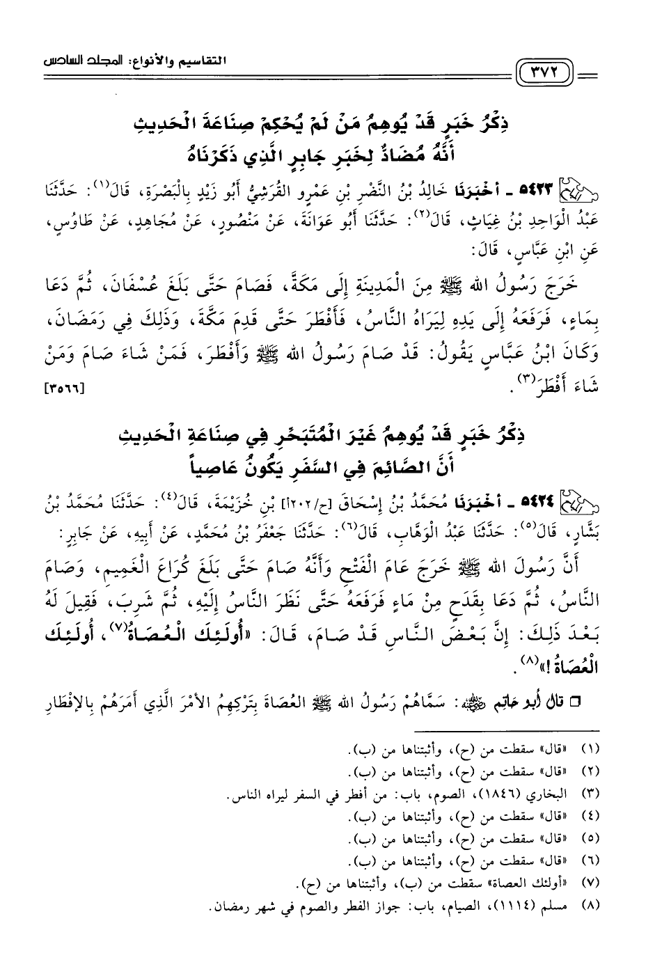 قَالَ أَبُو حَاتِمٍ رَضِيَ اللهُ عَنْهُ: سَمَّاهُمْ رَسُولُ اللهِ صَلى الله عَلَيه وسَلم الْعُصَاةَ بِتَرْكِهِمُ الأَمْرَ الَّذِي أَمَرَهُمْ بِالإِفْطَارِ فِي السَّفَرِ لِيَتَقَوَّوْا بِهِ، لَا أَنَّهُمْ عُصَاةٌ بِصَوْمِهِمْ فِي السَّفَرِ، إِذِ الصَّوْمُ وَالإِفْطَارُ فِي السَّفَرِ جَمِيعًا طَلْقٌ مُبَاحٌ. [٣٥٥١]