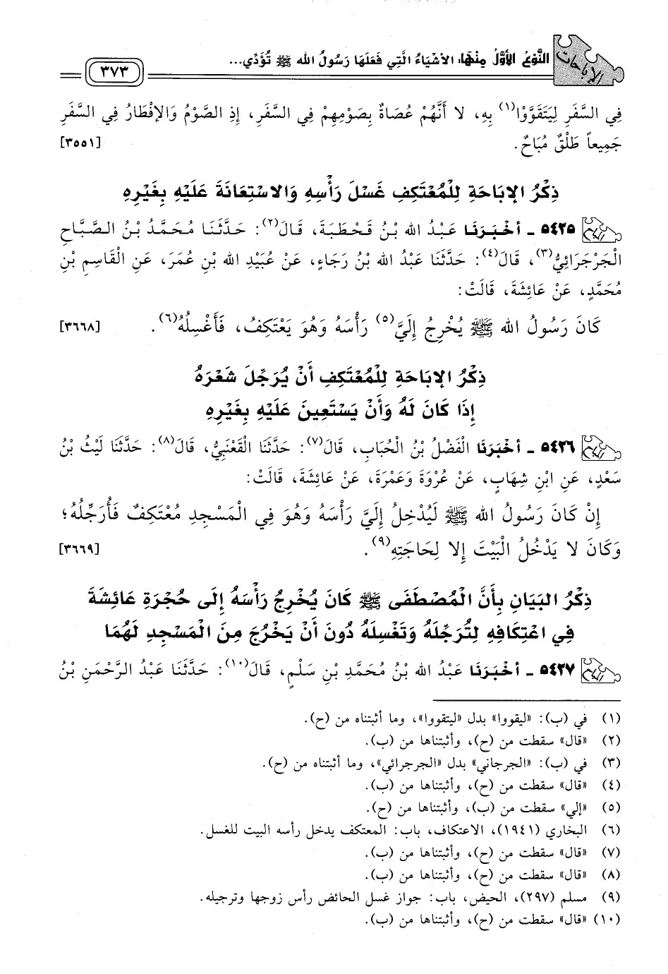 ٥٤٢٦ - أَخبَرنا الْفَضْلُ بْنُ الْحُبَابِ، قَالَ: حَدثنا الْقَعْنَبِيُّ، قَالَ: حَدثنا لَيْثُ بْنُ سَعْدٍ، عَنِ ابْنِ شِهَابٍ، عَنْ عُرْوَةَ وَعَمْرَةَ، عَنْ عَائِشَةَ، قَالَتْ: إِنْ كَانَ رَسُولُ اللهِ صَلى الله عَلَيه وسَلم لَيُدْخِلُ إِلَيَّ رَأْسَهُ وَهُوَ فِي الْمَسْجِدِ مُعْتَكِفٌ فَأُرَجِّلُهُ، وَكَانَ لَا يَدْخُلُ الْبَيْتَ إِلَاّ لِحَاجَتِهِ. [٣٦٦٩]
