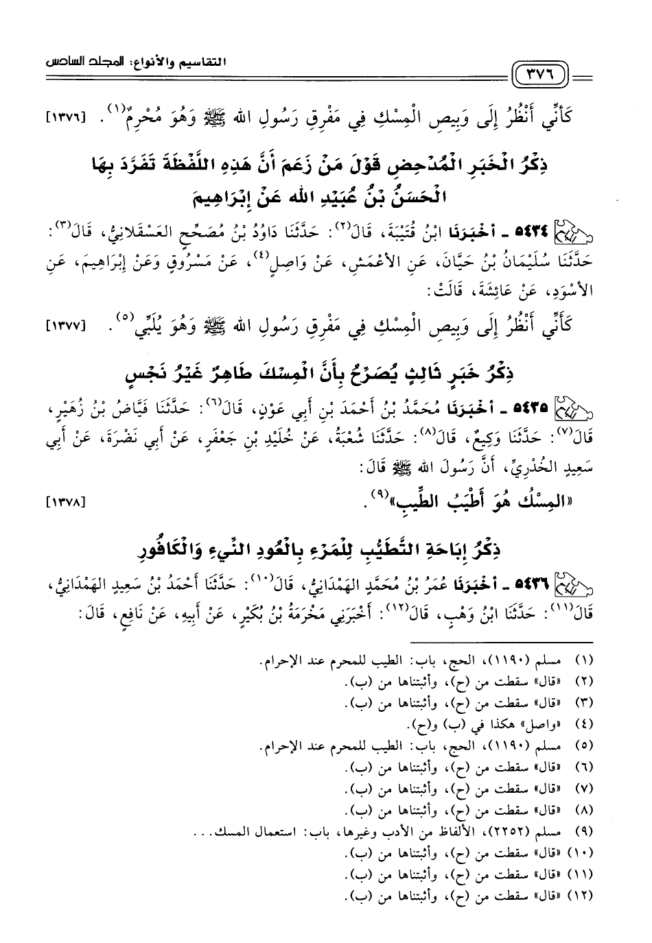 ٥٤٣٤ - أَخْبَرَنَا ابْنُ قُتَيْبَةَ، قَالَ: حَدَّثَنَا دَاوُدُ بْنُ مُصَحِّحٍ الْعَسْقَلَانِيُّ، قَالَ: حَدَّثَنَا سُلَيْمَانُ بْنُ حَيَّانَ، عَنِ الْأَعْمَشِ، عَنْ واصل، عَنْ مَسْرُوقٍ، وَعَنْ إِبْرَاهِيمَ، عَنِ الْأَسْوَدِ، عَنْ عَائِشَةَ، قَالَتْ: كَأَنِّي أَنْظُرُ إِلَى وَبِيصِ الْمِسْكِ فِي مَفْرِقِ رَسُولِ اللَّهِ صَلَّى اللَّهُ عَلَيْهِ وَسَلَّمَ وَهُوَ يُلَبِّي. [١٣٧٧]