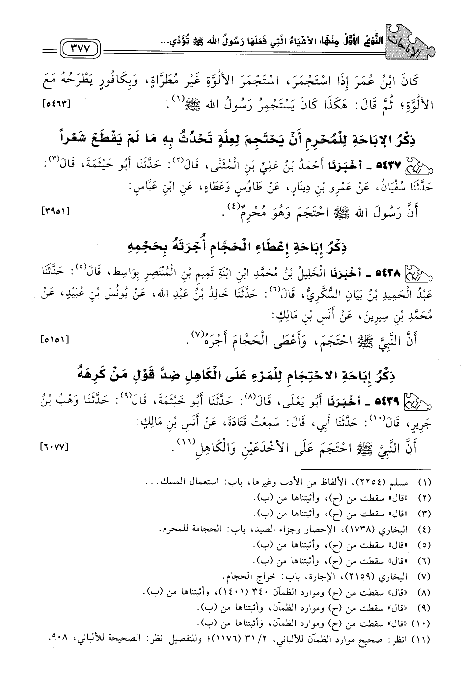 ٥٤٣٧ - أَخبَرنا أَحْمَدُ بْنُ عَلِيِّ بْنِ الْمُثَنَّى، قَالَ: حَدثنا أَبُو خَيْثَمَةَ، قَالَ: حَدثنا سُفْيَانُ، عَنْ عَمْرِو بْنِ دِينَارٍ، عَنْ طَاوُسٍ، وَعَطَاءٍ، عَنِ ابْنِ عَبَّاسٍ، أَنَّ رَسُولَ اللهِ صَلى الله عَلَيه وسَلم احْتَجَمَ وَهُوَ مُحْرِمٌ. [٣٩٥١]