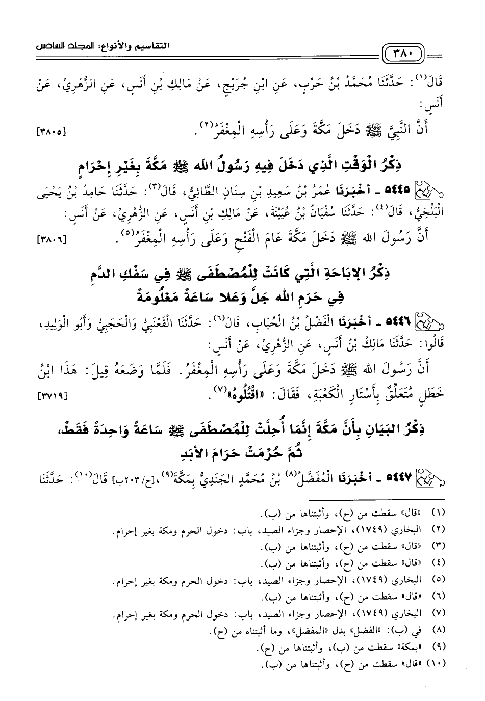 ٥٤٤٦ - أَخبَرنا الْفَضْلُ بْنُ الْحُبَابِ، قَالَ: حَدثنا الْقَعْنَبِيُّ وَالْحَجَبِيُّ وَأَبُو الْوَلِيدِ، قَالُوا: حَدثنا مَالِكُ بْنُ أَنَسٍ، عَنِ الزُّهْرِيِّ، عَنْ أَنَسٍ، أَنَّ رَسُولَ اللهِ صَلى الله عَلَيه وسَلم دَخَلَ مَكَّةَ وَعَلَى رَأْسِهِ الْمِغْفَرُ، فَلَمَّا وَضَعَهُ قِيلَ: هَذَا ابْنُ خَطَلٍ مُتَعَلِّقٌ بِأَسْتَارِ الْكَعْبَةَ، فَقَالَ: "اقْتُلُوهُ". [٣٧١٩]