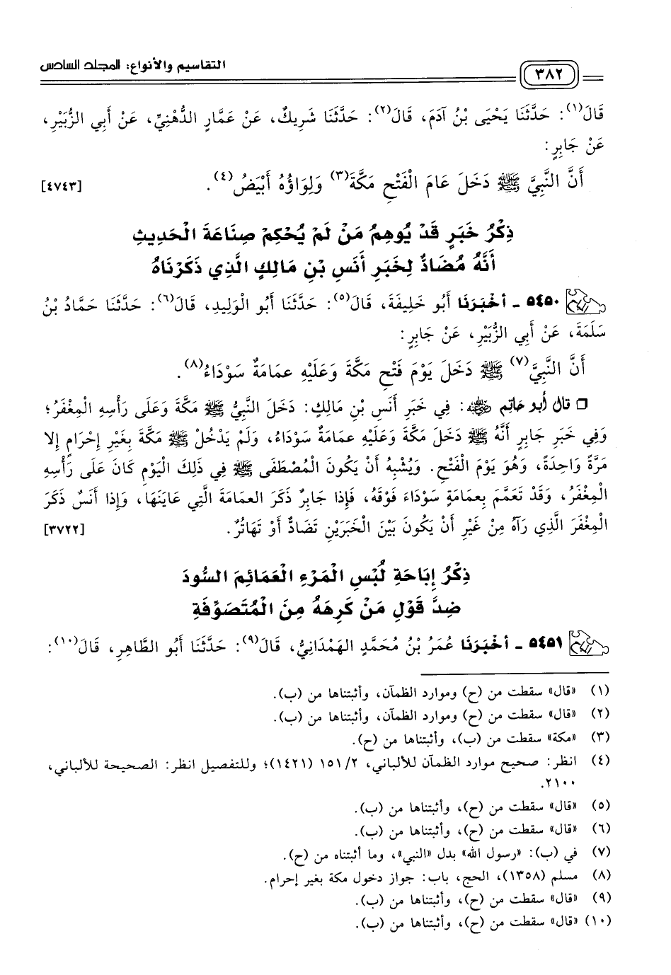 قَالَ أَبُو حَاتِمٍ رَضِيَ اللهُ عَنْهُ: فِي خَبَرِ أَنَسِ بْنِ مَالِكٍ: دَخَلَ النَّبِيُّ صَلى الله عَلَيه وسَلم مَكَّةَ وَعَلَى رَأْسِهِ الْمِغْفَرُ، وَفِي خَبَرِ جَابِرٍ أَنَّهُ صَلى الله عَلَيه وسَلم دَخَلَ مَكَّةَ وَعَلَيْهِ عِمَامَةٌ سَوْدَاءُ، وَلَمْ يَدْخُلْ صَلى الله عَلَيه وسَلم مَكَّةَ بِغَيْرِ إِحْرَامٍ إِلَاّ مَرَّةً وَاحِدَةً، وَهُوَ يَوْمَ الْفَتْحِ، وَيُشْبِهُ أَنْ يَكُونَ الْمُصْطَفَى صَلى الله عَلَيه وسَلم فِي ذَلِكَ الْيَوْمِ كَانَ عَلَى رَأْسِهِ الْمِغْفَرُ، وَقَدْ تَعَمَّمَ بِعِمَامَةٍ سَوْدَاءِ فَوْقَهُ، فَإِذًا جَابِرٌ ذَكَرَ الْعِمَامَةَ الَّتِي عَايَنَهَا، وَإِذًا أَنَسٌ ذَكَرَ الْمِغْفَرَ الَّذِي رَآهُ مِنْ غَيْرِ أَنْ يَكُونَ بَيْنَ الْخَبَرَيْنِ تَضَادٌّ أَوْ تَهَاتُرٌ. [٣٧٢٢]