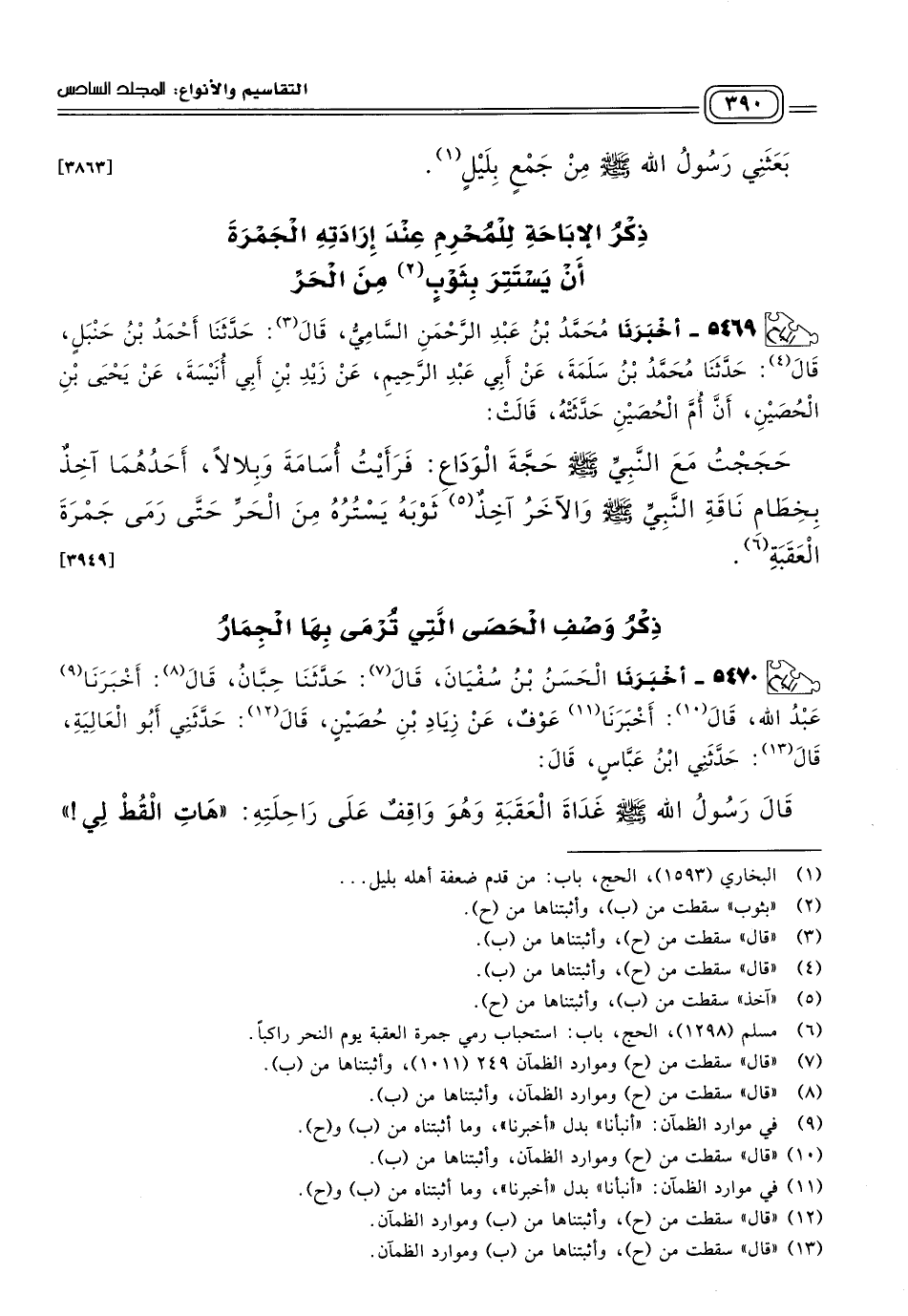 ٥٤٦٩ - أَخبَرنا مُحَمَّدُ بْنُ عَبْدِ الرَّحْمَنِ السَّامِيُّ، قَالَ: حَدثنا أَحْمَدُ بْنُ حَنْبَلٍ، قَالَ: حَدثنا مُحَمَّدُ بْنُ سَلَمَةَ، عَنْ أَبِي عَبْدِ الرَّحِيمِ، عَنْ زَيْدِ بْنِ أَبِي أُنَيْسَةَ، عَنْ يَحْيَى بْنِ الْحُصَيْنِ، أَنَّ أُمَّ الْحُصَيْنِ حَدَّثَتْهُ، قَالَتْ: حَجَجْتُ مَعَ النَّبِيِّ صَلى الله عَلَيه وسَلم حَجَّةَ الْوَدَاعِ، فَرَأَيْتُ أُسَامَةَ وَبِلَالاً، أَحَدُهُمَا آخِذٌ بِخِطَامِ نَاقَةِ النَّبِيِّ صَلى الله عَلَيه وسَلم وَالآخَرُ آخِذٌ ثَوْبَهُ يَسْتُرُهُ مِنَ الْحَرِّ حَتَّى رَمَى جَمْرَةَ الْعَقَبَةِ. [٣٩٤٩]