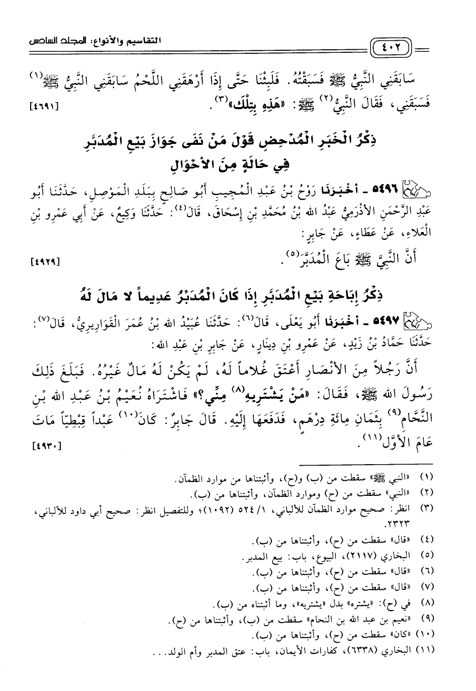 ٥٤٩٦ - أَخبَرنا رَوْحُ بْنُ عَبْدِ الْمُجِيبِ أَبُو صَالِحٍ بِبَلَدِ الْمَوْصِلِ، حَدثنا أَبُو عَبْدِ الرَّحْمَنِ الأَذْرَمِيُّ عَبْدُ اللهِ بْنُ مُحَمَّدِ بْنِ إِسْحَاقَ، قَالَ: حَدثنا وَكِيعٌ، عَنْ أَبِي عَمْرِو بْنِ الْعَلَاءِ، عَنْ عَطَاءٍ، عَنْ جَابِرٍ، أَنَّ النَّبِيَّ صَلى الله عَلَيه وسَلم بَاعَ الْمُدَبَّرَ. [٤٩٢٩]