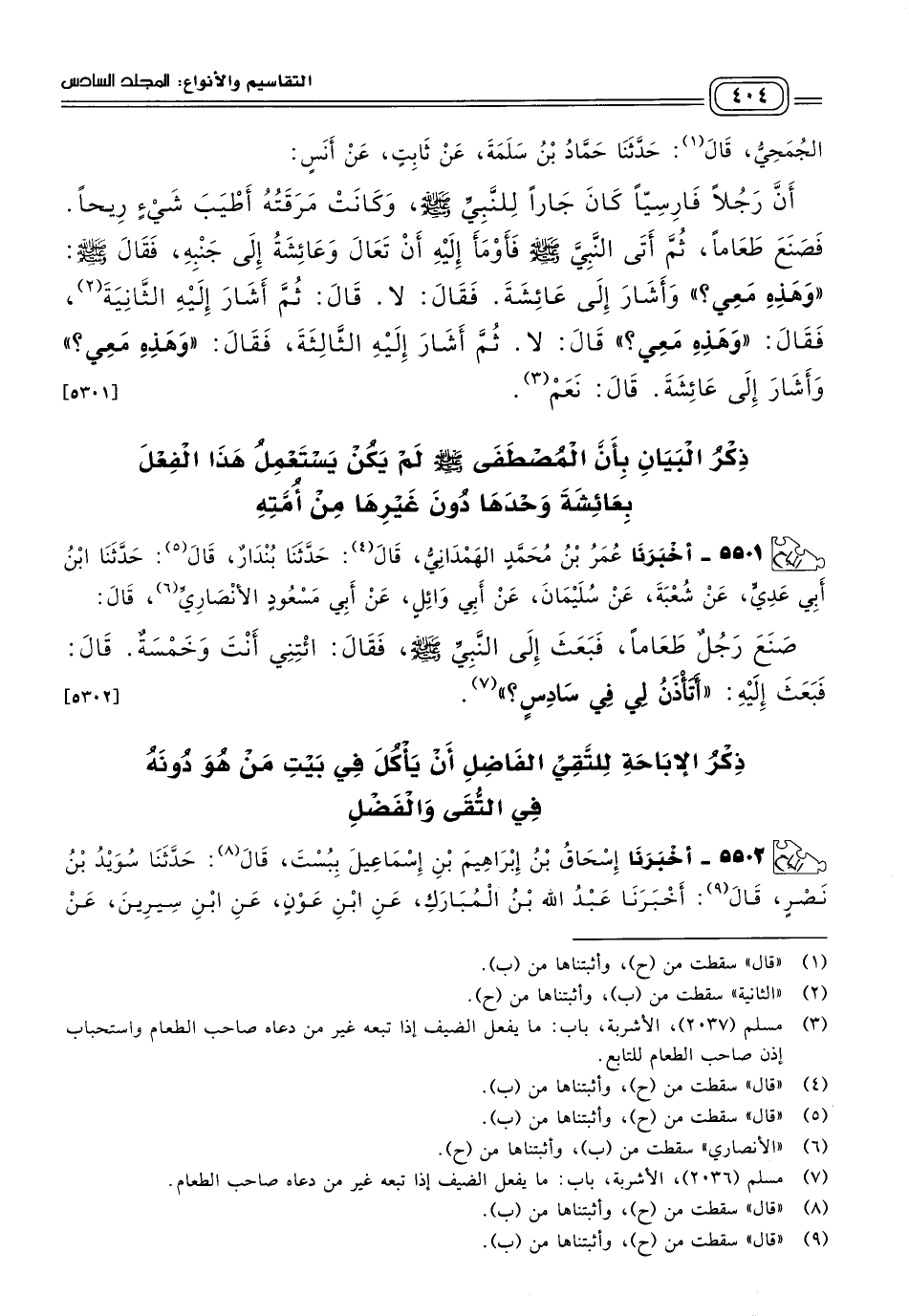 ٥٥٠١ - أَخبَرنا عُمَرُ بْنُ مُحَمَّدٍ الْهَمْدَانِيُّ، قَالَ: حَدثنا بُنْدَارٌ، قَالَ: حَدثنا ابْنُ أَبِي عَدِيٍّ، عَنْ شُعْبَةَ، عَنْ سُلَيْمَانَ، عَنْ أَبِي وَائِلٍ، عَنْ أَبِي مَسْعُودٍ الأنصاري، قَالَ: صَنَعَ رَجُلٌ طَعَامًا، فَبَعَثَ إِلَى النَّبِيِّ صَلى الله عَلَيه وسَلم، فَقَالَ: ائْتِنِي أَنْتَ وَخَمْسَةٌ، قَالَ: فَبَعَثَ إِلَيْهِ: "أَتَأْذَنُ لِي فِي سَادِسٍ؟ ". [٥٣٠٢]