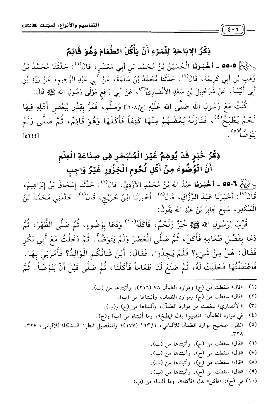 ٥٥٠٥ - أَخبَرنا الْحُسَيْنُ بْنُ مُحَمَّدِ بْنِ أَبِي مَعْشَرٍ، قَالَ: حَدثنا مُحَمَّدُ بْنُ وَهْبِ بْنِ أَبِي كَرِيمَةَ، قَالَ: حَدثنا مُحَمَّدُ بْنُ سَلَمَةَ، عَنْ أَبِي عَبْدِ الرَّحِيمِ، عَنْ زَيْدِ بْنِ أَبِي أُنَيْسَةَ، عَنْ شُرَحْبِيلَ بْنِ سَعْدٍ الأَنْصَارِيِّ، عَنْ أَبِي رَافِعٍ مَوْلَى رَسُولِ اللهِ صَلى الله عَلَيه وسَلم قَالَ: كُنْتُ مَعَ رَسُولِ اللهِ صَلى الله عَلَيه وسَلم، فَمَرَّ بِقِدْرٍ لِبَعْضِ أَهْلِهِ فِيهَا لَحْمٌ يُطْبَخُ، فَنَاوَلَهُ بَعْضُهُمْ مِنْهَا كَتِفًا فَأَكَلَهَا وَهُوَ قَائِمٌ، ثُمَّ صَلَّى وَلَمْ يَتَوَضَّأْ. [٥٢٤٤]