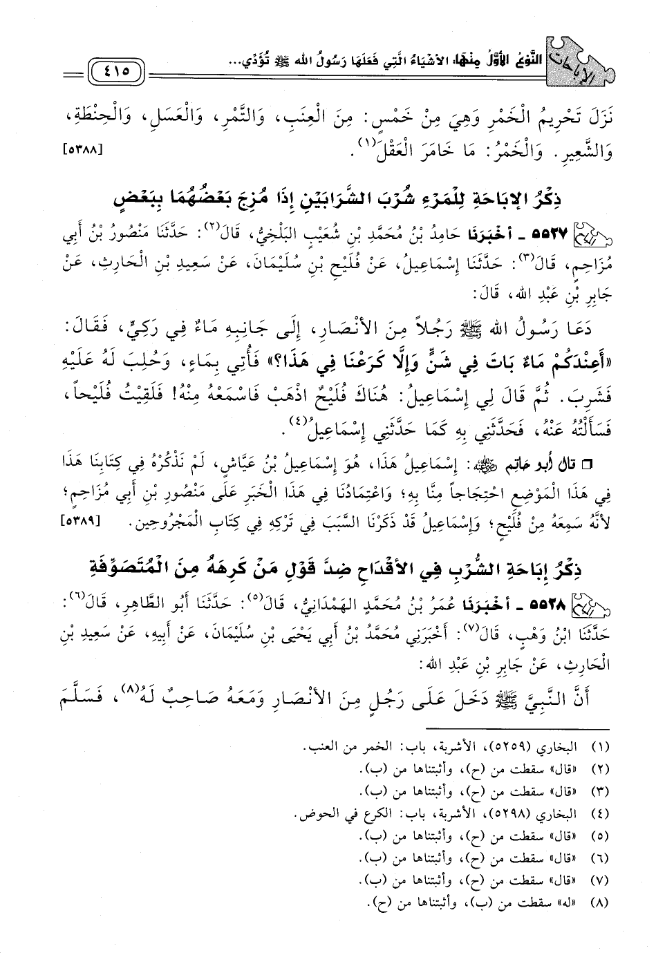 ٥٥٢٧ - أَخبَرنا حَامِدُ بْنُ مُحَمَّدِ بْنِ شُعَيْبٍ الْبَلْخِيُّ، قَالَ: حَدثنا مَنْصُورُ بْنُ أَبِي مُزَاحِمٍ، قَالَ: حَدثنا إِسْمَاعِيلُ، عَنْ فُلَيْحِ بْنِ سُلَيْمَانَ، عَنْ سَعِيدِ بْنِ الْحَارِثِ، عَنْ جَابِرِ بْنِ عَبْدِ اللهِ، قَالَ: دَعَا رَسُولُ اللهِ صَلى الله عَلَيه وسَلم رَجُلاً مِنَ الأَنْصَارِ، إِلَى جَانِبِهِ مَاءٌ فِي رَكِيٍّ، فَقَالَ: "أَعِنْدَكُمْ مَاءٌ بَاتَ فِي شَنٍّ وَإِلَاّ كَرَعْنَا فِي هَذَا؟ " فَأُتِيَ بِمَاءٍ، وَحُلِبَ لَهُ عَلَيْهِ فَشَرِبَ، ثُمَّ قَالَ لِي إِسْمَاعِيلُ: هُنَاكَ فُلَيْحٌ اذْهَبْ فَاسْمَعْهُ مِنْهُ، فَلَقِيتُ فُلَيْحًا، فَسَأَلْتُهُ عَنْهُ، فَحَدَّثَنِي بِهِ كَمَا حَدَّثَنِي إِسْمَاعِيلُ.