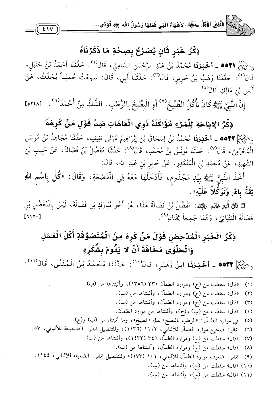 ٥٥٣١ - أَخبَرنا مُحَمَّدُ بْنُ عَبْدِ الرَّحْمَنِ السَّامِيُّ، قَالَ: حَدثنا أَحْمَدُ بْنُ حَنْبَلٍ، قَالَ: حَدثنا وَهْبُ بْنُ جَرِيرٍ، قَالَ: حَدثنا أَبِي، قَالَ: سَمِعْتُ حُمَيْدًا يُحَدِّثُ، عَنْ أَنَسِ بْنِ مَالِكٍ قال: إِنَّ النَّبِيَّ صَلى الله عَلَيه وسَلم كَانَ يَأْكُلُ الطِّبِّيخَ أَوِ الْبِطِّيخَ بِالرُّطَبِ.