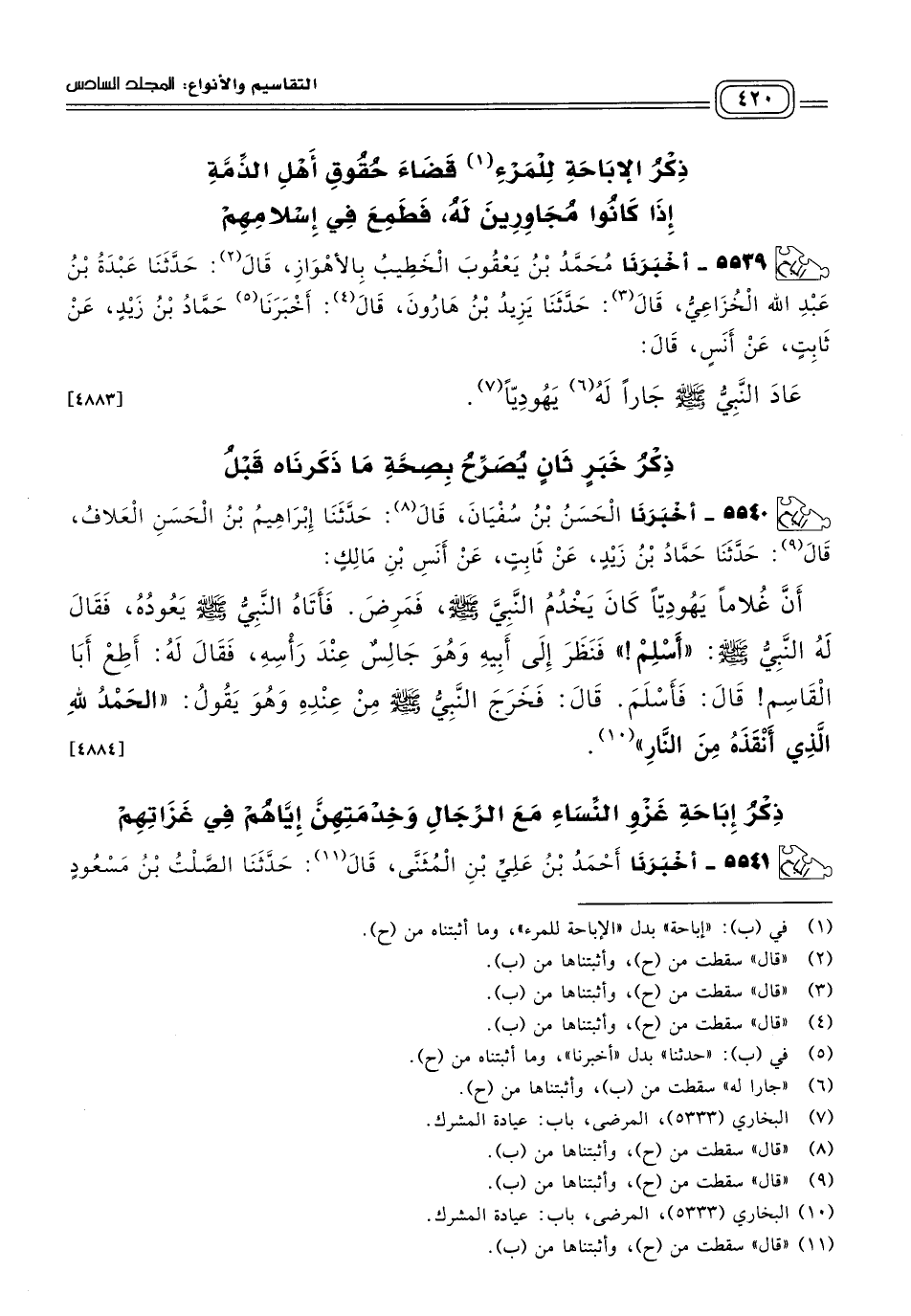٥٥٣٩ - أَخبَرنا مُحَمَّدُ بْنُ يَعْقُوبَ الْخَطِيبُ بِالأَهْوَازِ، قَالَ: حَدثنا عَبْدَةُ بْنُ عَبْدِ اللهِ الْخُزَاعِيُّ، قَالَ: حَدثنا يَزِيدُ بْنُ هَارُونَ، قَالَ: أخبرنا حَمَّادُ بْنُ زَيْدٍ، عَنْ ثَابِتٍ، عَنْ أَنَسٍ، قَالَ: عَادَ النَّبِيُّ صَلى الله عَلَيه وسَلم جارا له يَهُودِيًّا. [٤٨٨٣]