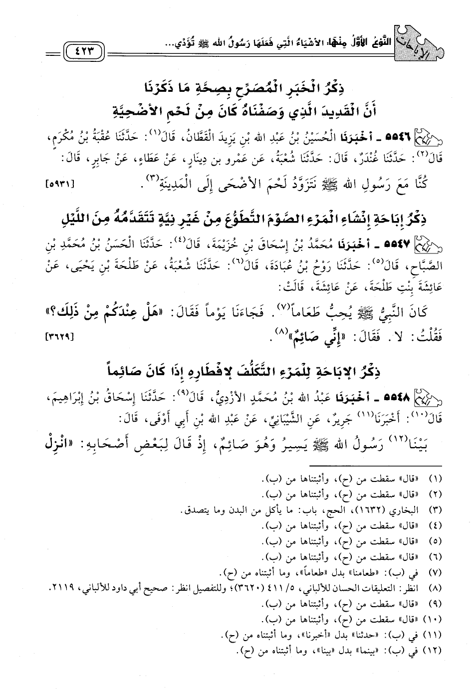 ٥٥٤٧ - أَخبَرنا مُحَمَّدُ بْنُ إِسْحَاقَ بْنِ خُزَيْمَةَ، قَالَ: حَدثنا الْحَسَنُ بْنُ مُحَمَّدِ بْنِ الصَّبَّاحِ، قَالَ: حَدثنا رَوْحُ بْنُ عُبَادَةَ، قَالَ: حَدثنا شُعْبَةُ، عَنْ طَلْحَةَ بْنِ يَحْيَى، عَنْ عَائِشَةَ بِنْتِ طَلْحَةَ، عَنْ عَائِشَةَ، قَالَتْ: كَانَ النَّبِيُّ صَلى الله عَلَيه وسَلم يُحِبُّ طَعَاماً، فَجَاءَنَا يَوْمًا فَقَالَ: "هَلْ عِنْدَكُمْ مِنْ ذَلِكَ؟ " فَقُلْتُ: لَا، فَقَالَ: "إِنِّي صَائِمٌ". [٣٦٢٩]