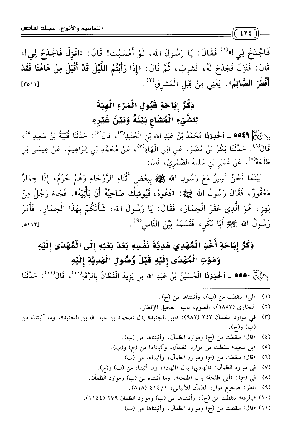 ذِكْرُ إِبَاحَةِ أَخْذِ الْمُهْدِي هَدِيَّةَ نَفْسِهِ بَعْدَ بَعْثِهِ إِلَى الْمُهْدَى إِلَيْهِ وَمَوْتِ الْمُهْدَى إِلَيْهِ قَبْلَ وُصُولِ الْهَدِيَّةِ إِلَيْهِ.
