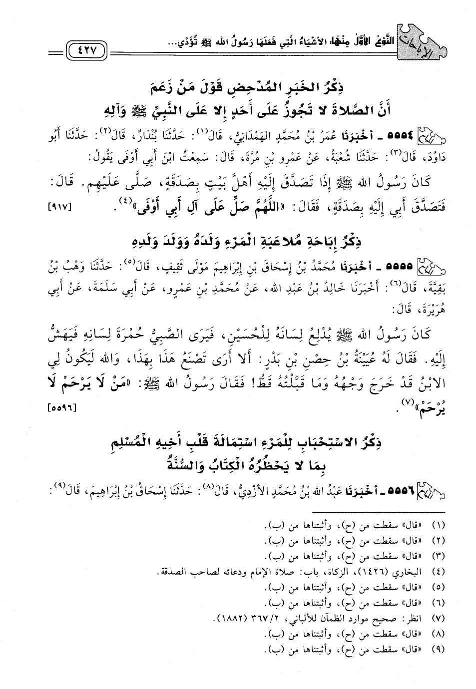 ٥٥٥٥ - أَخْبَرَنَا مُحَمَّدُ بْنُ إِسْحَاقَ بْنِ إِبْرَاهِيمَ مَوْلَى ثَقِيفٍ، قَالَ: حَدَّثَنَا وَهْبُ بْنُ بَقِيَّةَ، قَالَ: أَخْبَرَنَا خَالِدُ بْنُ عَبْدِ اللهِ، عَنْ مُحَمَّدِ بْنِ عَمْرٍو، عَنْ أَبِي سَلَمَةَ، عَنْ أَبِي هُرَيْرَةَ، قَالَ: كَانَ رَسُولُ اللهِ صَلَّى اللَّهُ عَلَيْهِ وَسَلَّمَ يُدْلِعُ لِسَانَهُ لِلْحُسَيْنِ، فَيَرَى الصَّبِيُّ حُمْرَةَ لِسَانِهِ فَيَهَشُّ إِلَيْهِ، فَقَالَ لَهُ عُيَيْنَةُ بْنُ حِصْنِ بْنِ بَدْرٍ: أَلَا أَرَى تَصْنَعُ هَذَا بِهَذَا، وَاللهِ لَيَكُونُ لِيَ الاِبْنُ قَدْ خَرَجَ وَجْهُهُ وَمَا قَبَّلْتُهُ قَطُّ! فَقَالَ رَسُولُ اللهِ صَلَّى اللَّهُ عَلَيْهِ وَسَلَّمَ: "مَنْ لَا يَرْحَمْ لَا يُرْحَمْ". [٥٥٩٦]
