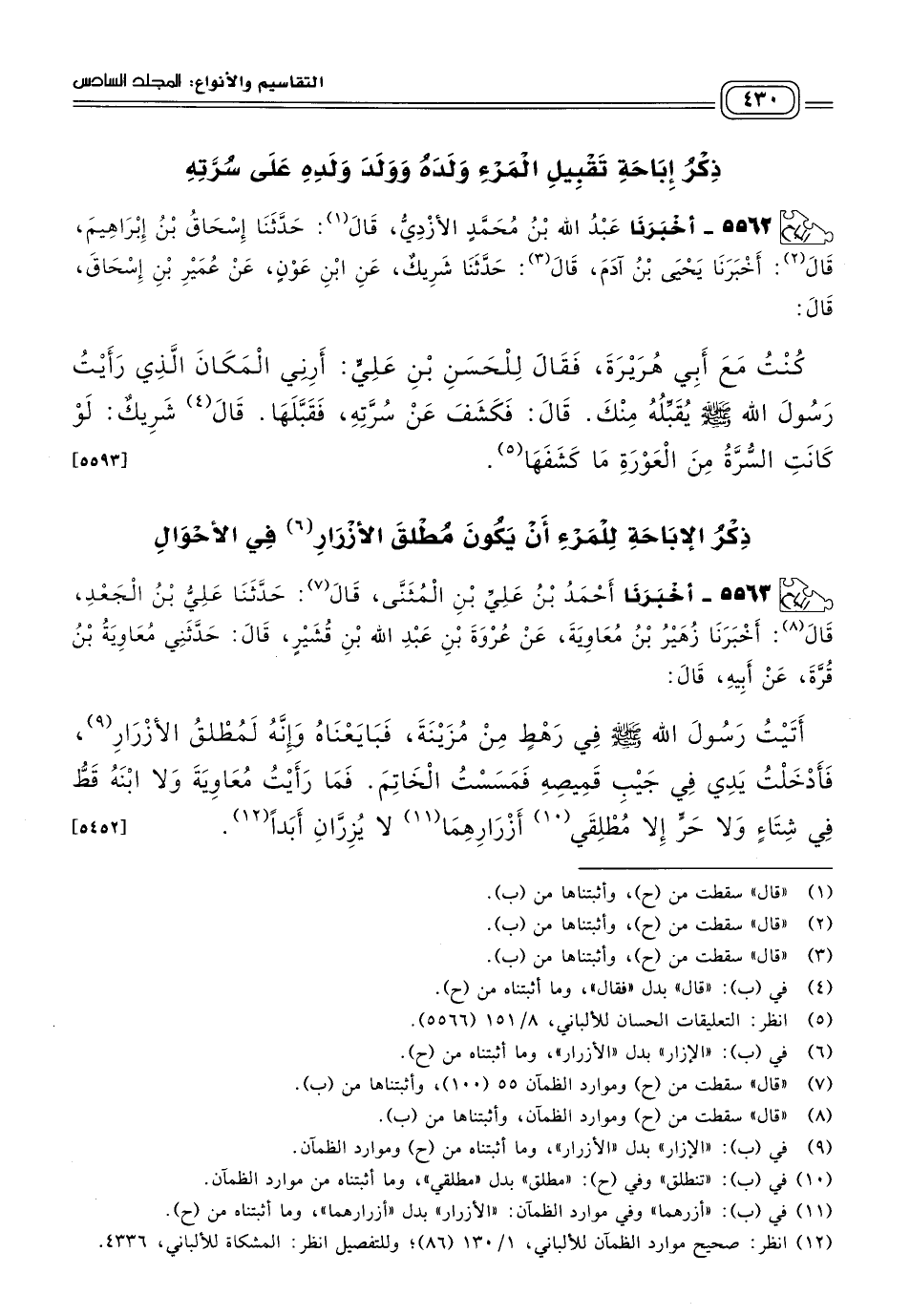 ٥٥٦٢ - أَخبَرنا عَبْدُ اللهِ بْنُ مُحَمَّدٍ الأَزْدِيُّ، قَالَ: حَدثنا إِسْحَاقُ بْنُ إِبْرَاهِيمَ، قَالَ: أَخبَرنا يَحْيَى بْنُ آدَمَ، قَالَ: حَدثنا شَرِيكٌ، عَنِ ابْنِ عَوْنٍ، عَنْ عُمَيْرِ بْنِ إِسْحَاقَ، قَالَ: كُنْتُ مَعَ أَبِي هُرَيْرَةَ، فَقَالَ لِلْحَسَنِ بْنِ عَلِيٍّ: أَرِنِي الْمَكَانَ الَّذِي رَأَيْتُ رَسُولَ اللهِ صَلى الله عَلَيه وسَلم يُقَبِّلُهُ مِنْكَ، قَالَ: فَكَشَفَ عَنْ سُرَّتِهِ، فَقَبَّلَهَا، قَالَ شَرِيكٌ: لَوْ كَانَتِ السُّرَّةُ مِنَ الْعَوْرَةِ مَا كَشَفَهَا. [٥٥٩٣]