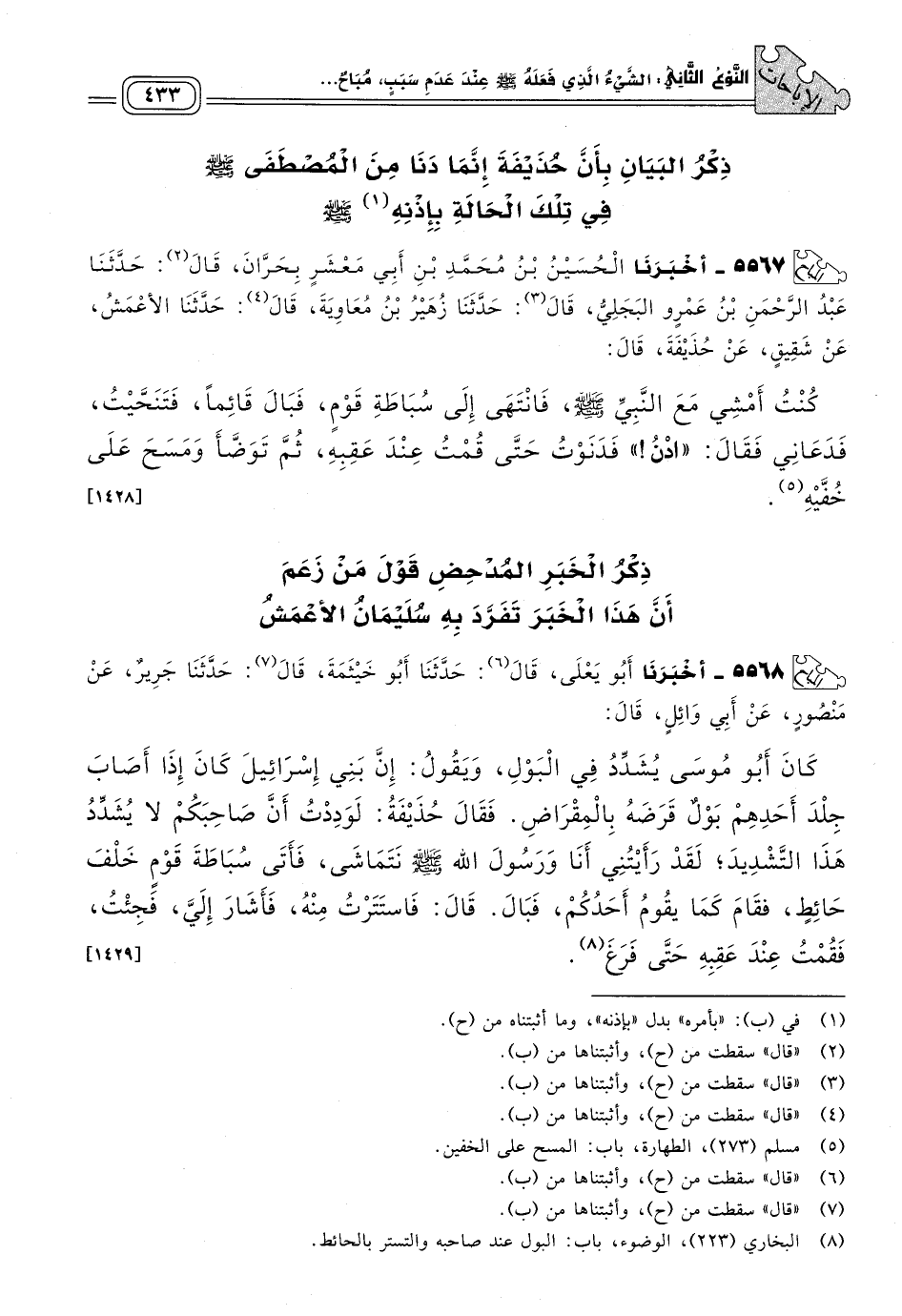 ٥٥٦٧ - أَخبَرنا الْحُسَيْنُ بْنُ مُحَمَّدِ بْنِ أَبِي مَعْشَرٍ بِحَرَّانَ، قَالَ: حَدثنا عَبْدُ الرَّحْمَنِ بْنُ عَمْرٍو الْبَجَلِيُّ، قَالَ: حَدثنا زُهَيْرُ بْنُ مُعَاوِيَةَ، قَالَ: حَدثنا الأَعْمَشُ، عَنْ شَقِيقٍ، عَنْ حُذَيْفَةَ، قَالَ: كُنْتُ أَمْشِي مَعَ النَّبِيِّ صَلى الله عَلَيه وسَلم، فَانْتَهَى إِلَى سُبَاطَةِ قَوْمٍ، فَبَالَ قَائِمًا، فَتَنَحَّيْتُ، فَدَعَانِي فَقَالَ: "ادْنُ! " فَدَنَوْتُ حَتَّى قُمْتُ عِنْدَ عَقِبِهِ، ثُمَّ تَوَضَّأَ وَمَسَحَ عَلَى خُفَّيْهِ. [١٤٢٨]
