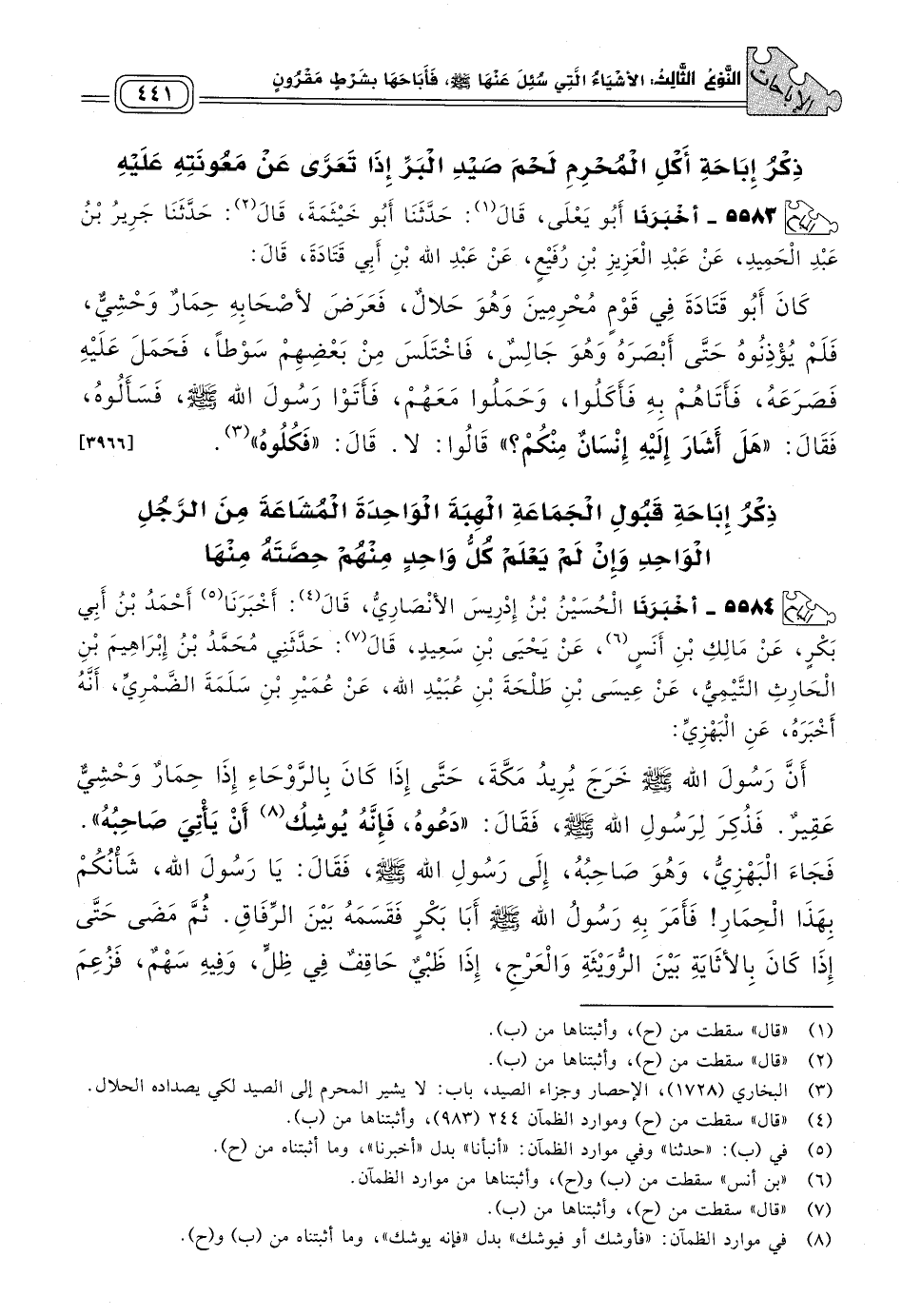 ٥٥٨٣ - أَخبَرنا أَبُو يَعْلَى، قَالَ: حَدثنا أَبُو خَيْثَمَةَ، قَالَ: حَدثنا جَرِيرُ بْنُ عَبْدِ الْحَمِيدِ، عَنْ عَبْدِ الْعَزِيزِ بْنِ رُفَيْعٍ، عَنْ عَبْدِ اللهِ بْنِ أَبِي قَتَادَةَ، قَالَ: كَانَ أَبُو قَتَادَةَ فِي قَوْمٍ مُحْرِمِينَ وَهُوَ حَلَالٌ، فَعَرَضَ لأَصْحَابِهِ حِمَارٌ وَحْشِيٌّ، فَلَمْ يُؤْذِنُوهُ حَتَّى أَبْصَرَهُ وَهُوَ جَالِسٌ، فَاخْتَلَسَ مِنْ بَعْضِهِمْ سَوْطًا، فَحَمَلَ عَلَيْهِ فَصَرَعَهُ، فَأَتَاهُمْ بِهِ فَأَكَلُوا، وَحَمَلُوا مَعَهُمْ، فَأَتَوْا رَسُولُ اللهِ صَلى الله عَلَيه وسَلم، فَسَأَلُوهُ، فَقَالَ: "هَلْ أَشَارَ إِلَيْهِ إِنْسَانٌ مِنْكُمْ؟ " قَالُوا: لَا، قَالَ: "فَكُلُوهُ". [٣٩٦٦]