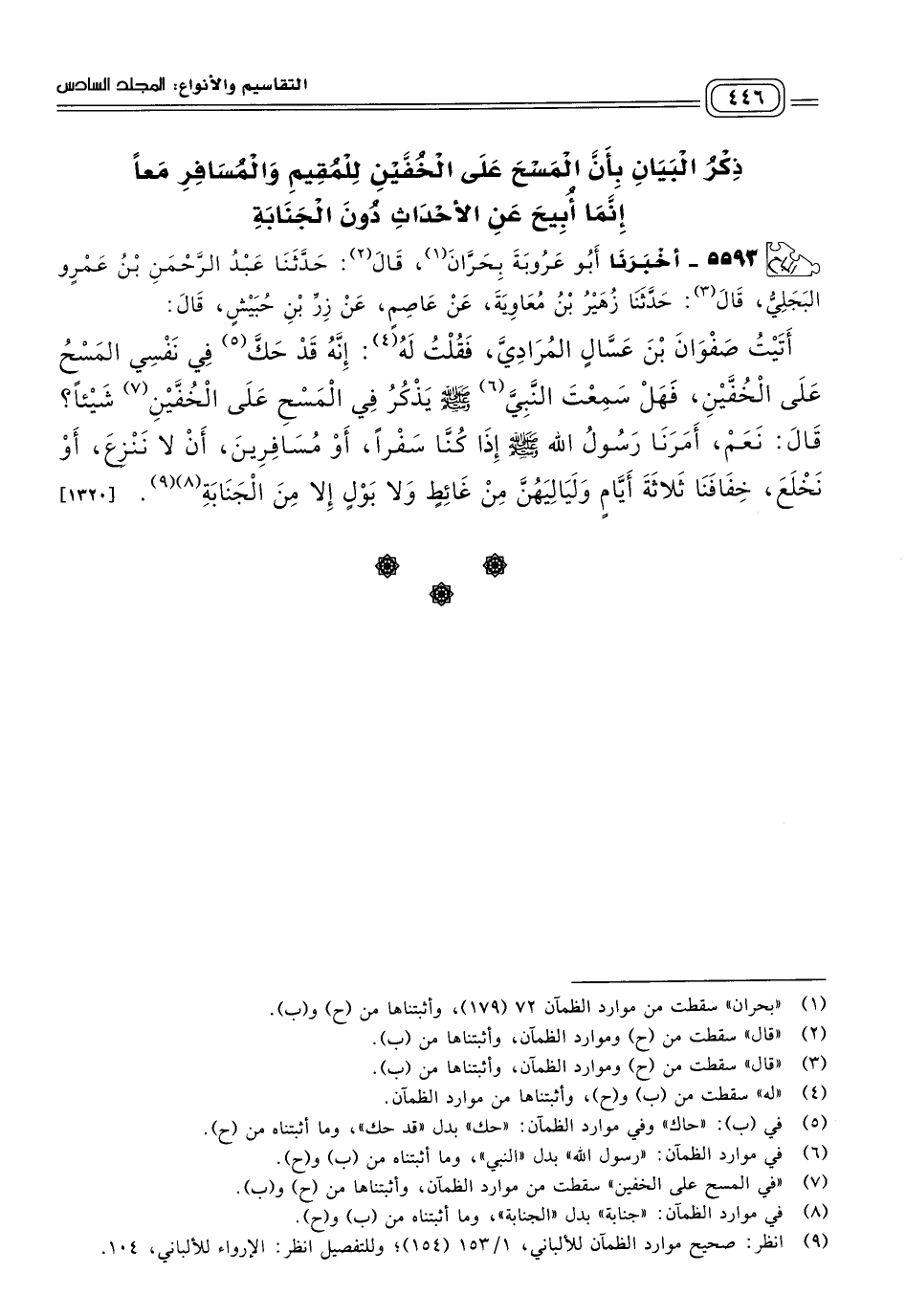 ٥٥٩٣ - أَخبَرنا أَبُو عَرُوبَةَ بِحَرَّانَ، قَالَ: حَدثنا عَبْدُ الرَّحْمَنِ بْنُ عَمْرٍو الْبَجَلِيُّ، قَالَ: حَدثنا زُهَيْرُ بْنُ مُعَاوِيَةَ، عَنْ عَاصِمٍ، عَنْ زِرِّ بْنِ حُبَيْشٍ، قَالَ: أَتَيْتُ صَفْوَانَ بْنَ عَسَّالٍ الْمُرَادِيَّ، فَقُلْتُ له: إِنَّهُ قد حَكَّ فِي نَفْسِي الْمَسْحُ عَلَى الْخُفَّيْنِ، فَهَلْ سَمِعْتَ النَّبِيَّ صَلى الله عَلَيه وسَلم يَذْكُرُ فِي الْمَسْحِ عَلَى الْخُفَّيْنِ شَيْئًا؟ قَالَ: نَعَمْ، أَمَرَنَا رَسُولُ اللهِ صَلى الله عَلَيه وسَلم إِذَا كُنَّا سَفْرًا، أَوْ مُسَافِرِينَ، أَنْ لَا نَنْزِعَ، أَوْ نَخْلَعَ، خِفَافَنَا ثَلَاثَةَ أَيَّامٍ وَلَيَالِيَهُنَّ مِنْ غَائِطٍ وَلَا بَوْلٍ إِلَاّ مِنَ الْجَنَابَةِ. [١٣٢٠]