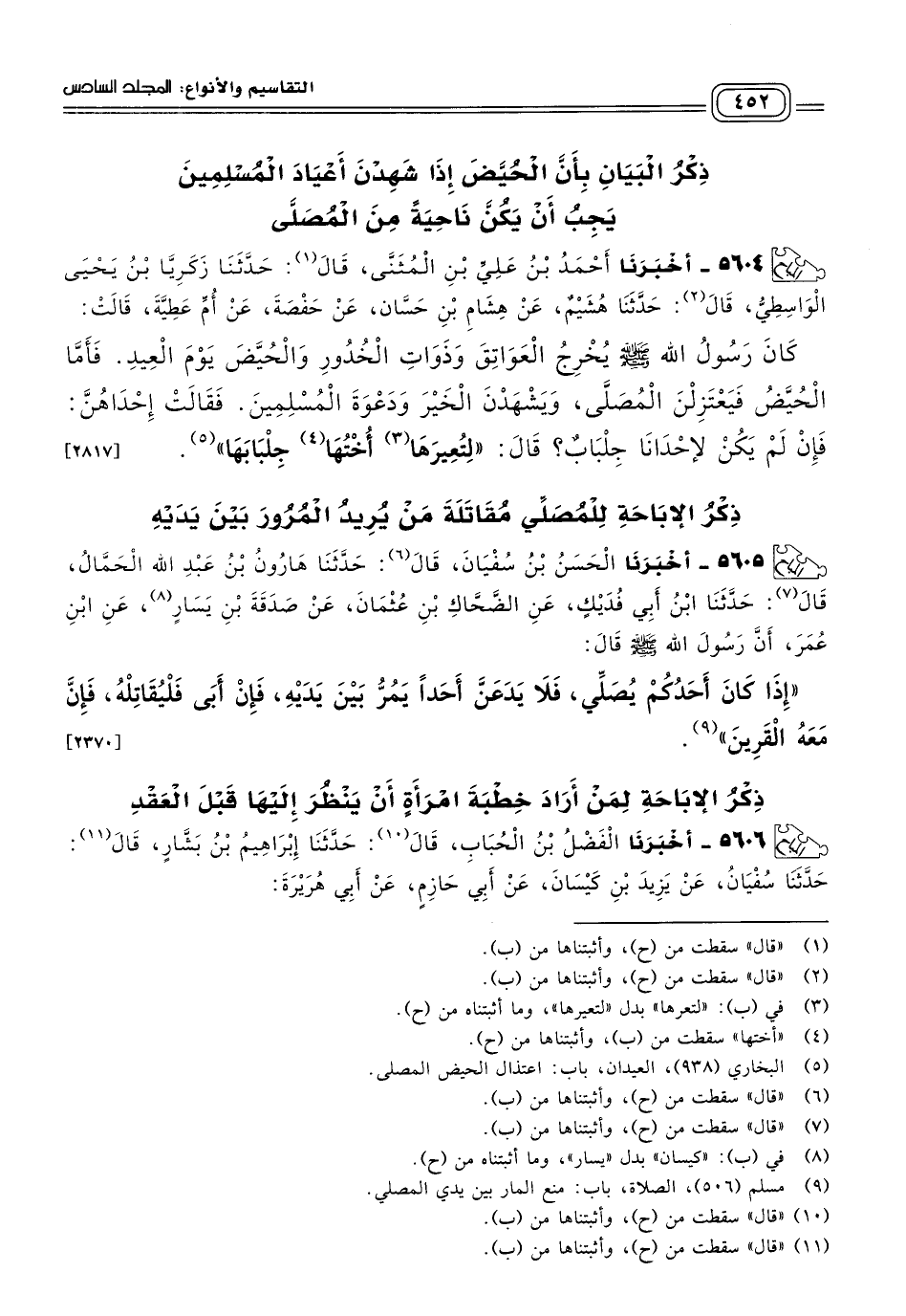 ٥٦٠٤ - أَخبَرنا أَحْمَدُ بْنُ عَلِيِّ بْنِ الْمُثَنَّى، قَالَ: حَدثنا زَكَرِيَّا بْنُ يَحْيَى الْوَاسِطِيُّ، قَالَ: حَدثنا هُشَيْمٌ، عَنْ هِشَامِ بْنِ حَسَّانَ، عَنْ حَفْصَةَ، عَنْ أُمِّ عَطِيَّةَ، قَالَتْ: كَانَ رَسُولُ اللهِ صَلى الله عَلَيه وسَلم يُخْرِجُ الْعَوَاتِقَ وَذَوَاتِ الْخُدُورِ وَالْحُيَّضَ يَوْمَ الْعِيدِ، فَأَمَّا الْحُيَّضُ فَيَعْتَزِلْنَ الْمُصَلَّى، وَيَشْهَدْنَ الْخَيْرَ وَدَعْوَةَ الْمُسْلِمِينَ، فَقَالَتْ إِحْدَاهُنَّ: فَإِنْ لَمْ يَكُنْ لإِحْدَانَا جِلْبَابٌ؟ قَالَ: "لِتُعِيرَهَا أُخْتُهَا جِلْبَابَهَا". [٢٨١٧]