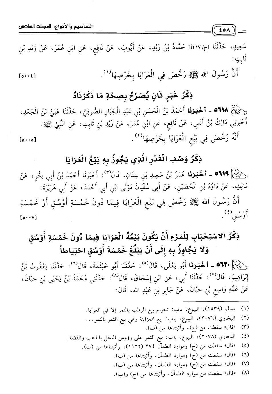 ٥٦١٨ - أَخبَرنا أَحْمَدُ بْنُ الْحَسَنِ بْنِ عَبْدِ الْجَبَّارِ الصُّوفِيُّ، حَدثنا عَلِيُّ بْنُ الْجَعْدِ، أَخْبَرَنِي مَالِكُ بْنُ أَنَسٍ، عَنْ نَافِعٍ، عَنِ ابْنِ عُمَرَ، عَنْ زَيْدِ بْنِ ثَابِتٍ، عَنِ النَّبِيِّ صَلى الله عَلَيه وسَلم، أَنَّهُ رَخَّصَ فِي بَيْعِ الْعَرَايَا بِخَرْصِهَا. [٥٠٠٥]
