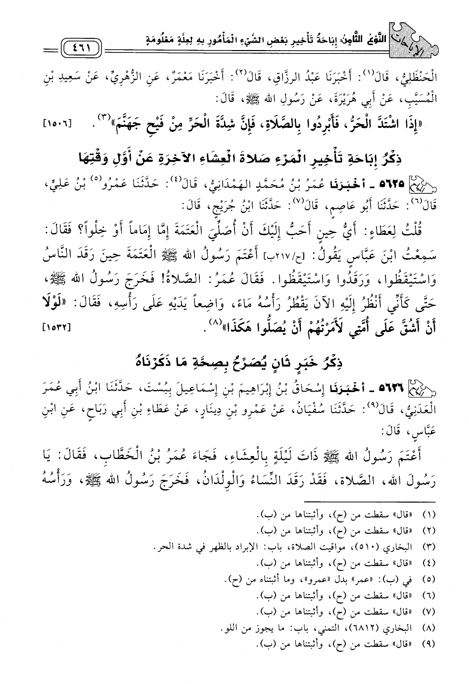 ٥٦٢٥ - أَخبَرنا عُمَرُ بْنُ مُحَمَّدٍ الْهَمْدَانِيُّ، قَالَ: حَدثنا عَمْرُو بْنُ عَلِيٍّ، قَالَ: حَدثنا أَبُو عَاصِمٍ، قَالَ: حَدثنا ابْنُ جُرَيْجٍ، قَالَ: قُلْتُ لِعَطَاءٍ: أَيُّ حِينٍ أَحَبُّ إِلَيْكَ أَنْ أُصَلِّيَ الْعَتَمَةَ إِمَّا إِمَامًا أَوْ خِلْوًا؟ فَقَالَ: سَمِعْتُ ابْنَ عَبَّاسٍ يَقُولُ: أَعْتَمَ رَسُولُ اللهِ صَلى الله عَلَيه وسَلم الْعَتَمَةَ حِينَ رَقَدَ النَّاسُ وَاسْتَيْقَظُوا، وَرَقَدُوا وَاسْتَيْقَظُوا، فَقَالَ عُمَرُ: الصَّلَاةُ! فَخَرَجَ رَسُولُ اللهِ صَلى الله عَلَيه وسَلم، حَتَّى كَأَنِّي أَنْظُرُ إِلَيْهِ الآنَ يَقْطُرُ رَأْسُهُ مَاءً، وَاضِعًا يَدَيْهِ عَلَى رَأْسِهِ، فَقَالَ: "لَوْلَا أَنْ أَشُقَّ عَلَى أُمَّتِي لأَمَرْتُهُمْ أَنْ يُصَلُّوا هَكَذَا". [١٥٣٢]