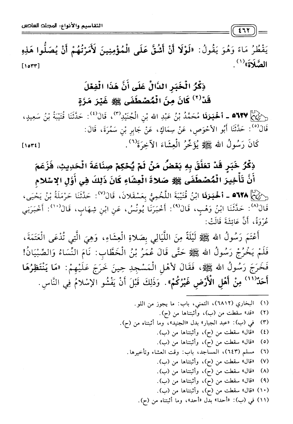 ذِكْرُ خَبَرٍ قَدْ تَعَلَّقَ بِهِ بَعْضُ مَنْ لَمْ يُحْكِمْ صِنَاعَةَ الْحَدِيثِ فَزَعَمَ أَنَّ تَأْخِيرَ الْمُصْطَفَى صَلى الله عَلَيه وسَلم صَلَاةَ الْعِشَاءِ كَانَ ذَلِكَ فِي أَوَّلِ الإِسْلَامِ.